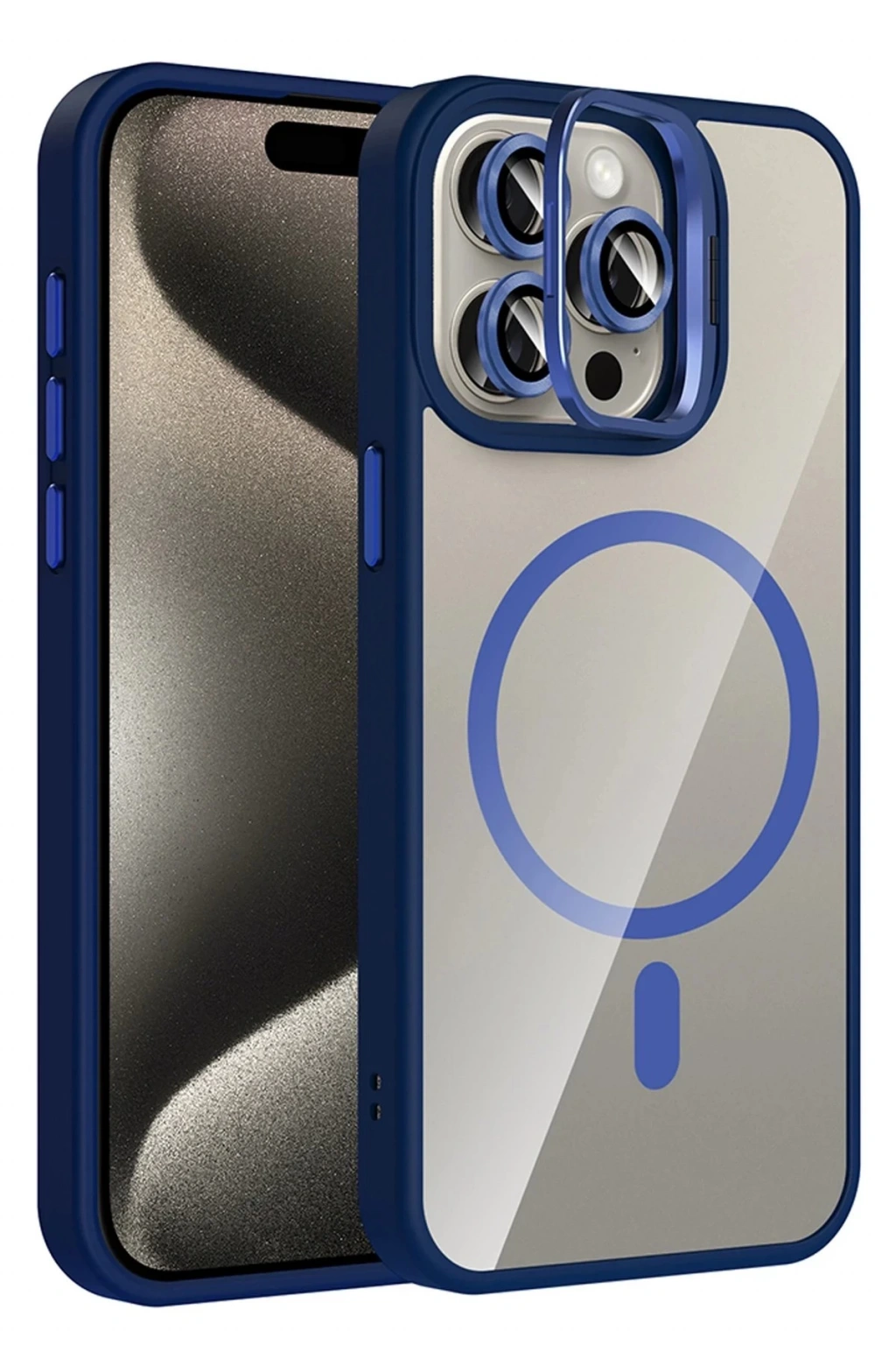 Apple iPhone 14 Pro Max Remim Lensli Magsafe Standlı Kapak - Lacivert