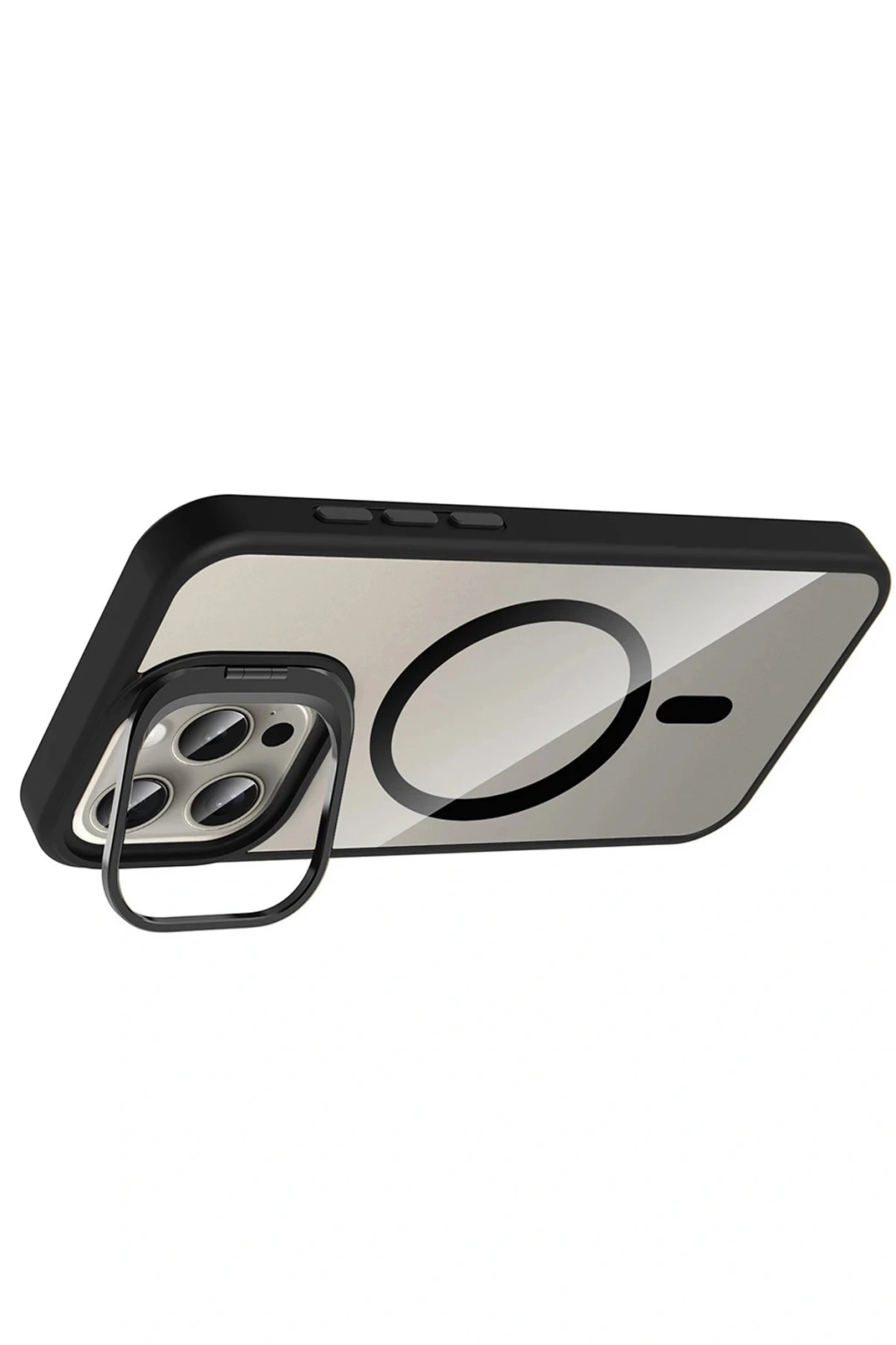 Apple iPhone 14 Pro Max Remim Lensli Magsafe Standlı Kapak - Siyah