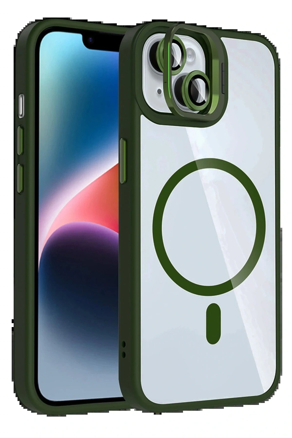 Apple iPhone 14 Remim Lensli Magsafe Standlı Kapak - Koyu Yeşil