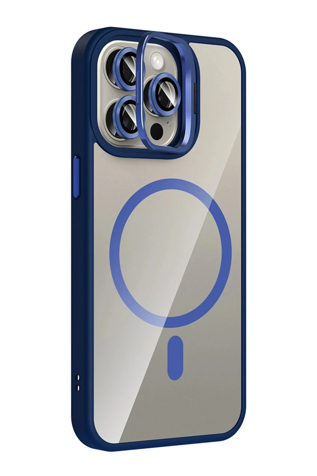 Apple iPhone 15 Pro Max Remim Lensli Magsafe Standlı Kapak - Lacivert