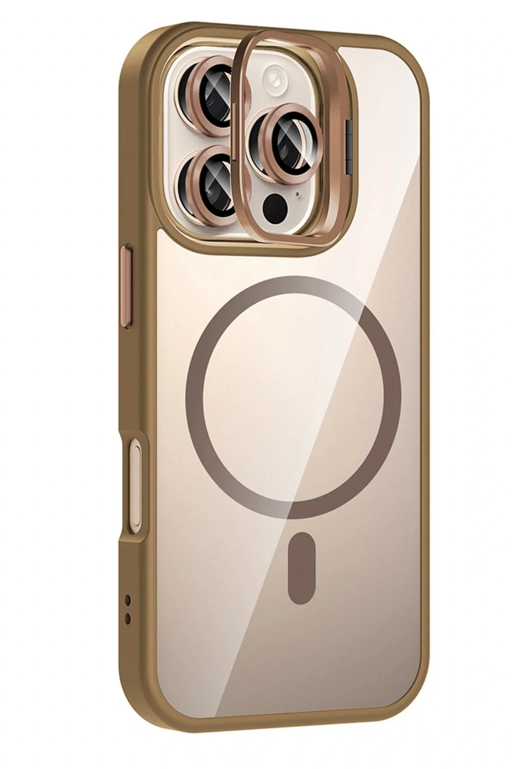 Apple iPhone 16 Pro Remim Lensli Magsafe Standlı Kapak - Kahverengi
