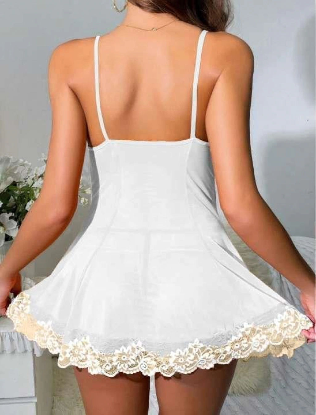 Beyaz Dantel İşlemeli İnce Askılı Likralı Fantezi Tül Gecelik