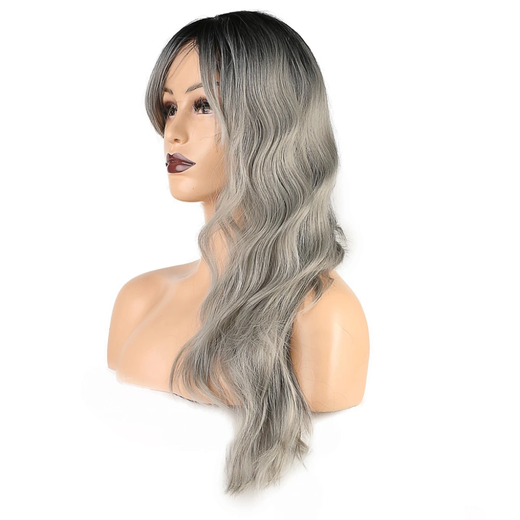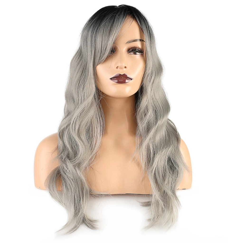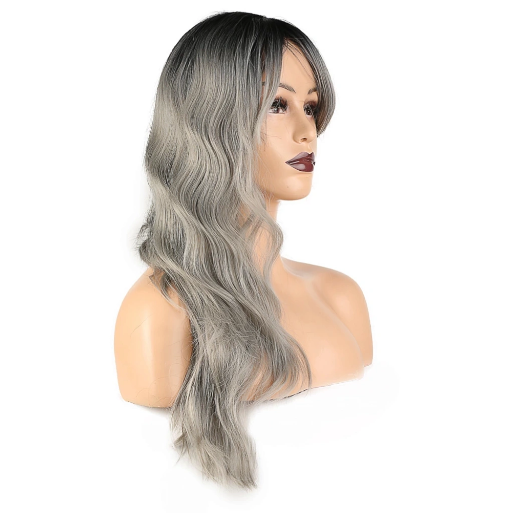 Dalgalı Perçemli Uzun Fiber Sentetik Peruk - Siyah / Gri Ombreli