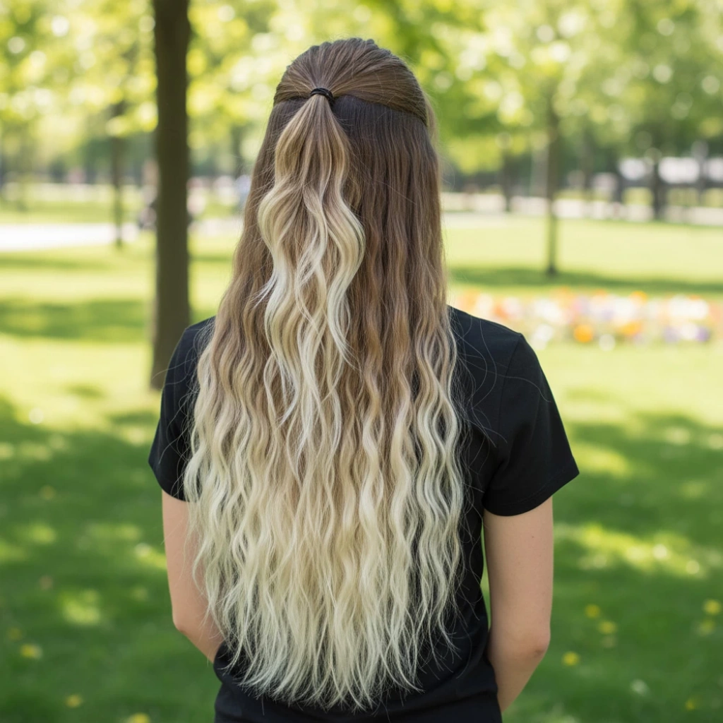 Fiber Sentetik Kabarık Dalgalı Yarım Ay + 2 Yan Çıt Çıt - Koyu Kumral Platin Ombreli