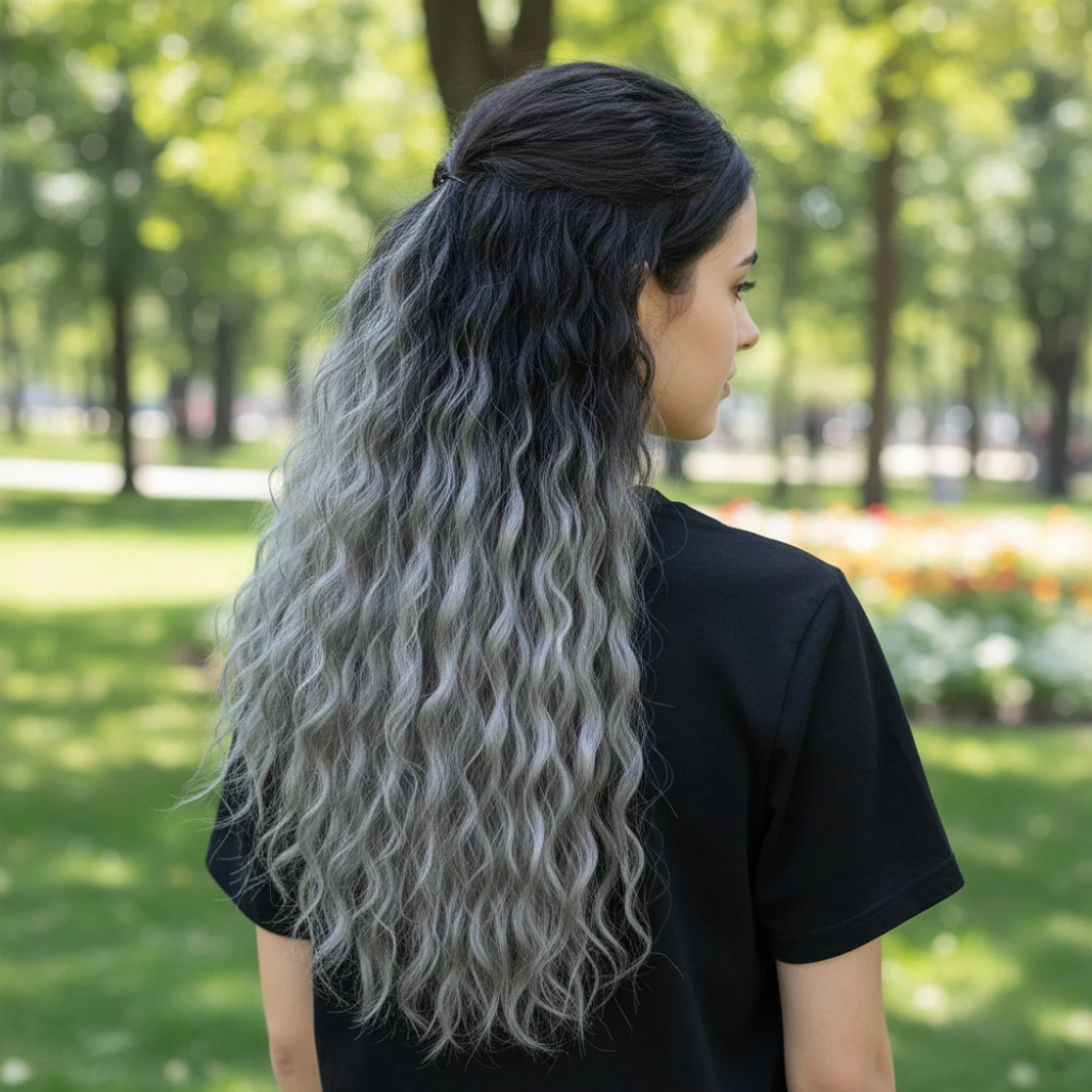 Fiber Sentetik Kabarık Dalgalı Yarım Ay + 2 Yan Çıt Çıt - Siyah Gri Ombreli