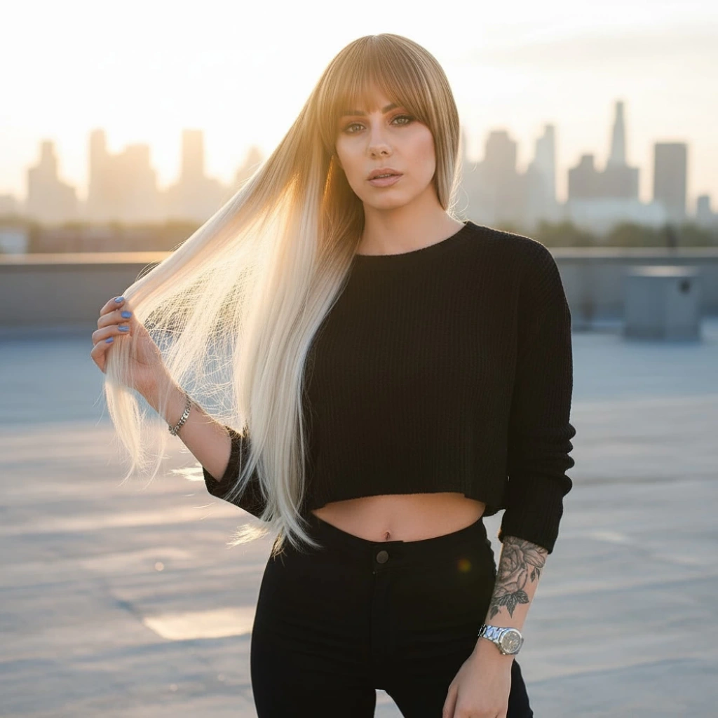 Fiber Sentetik Uzun Düz Kahküllü Peruk - Balköpüğü / Platin Ombreli