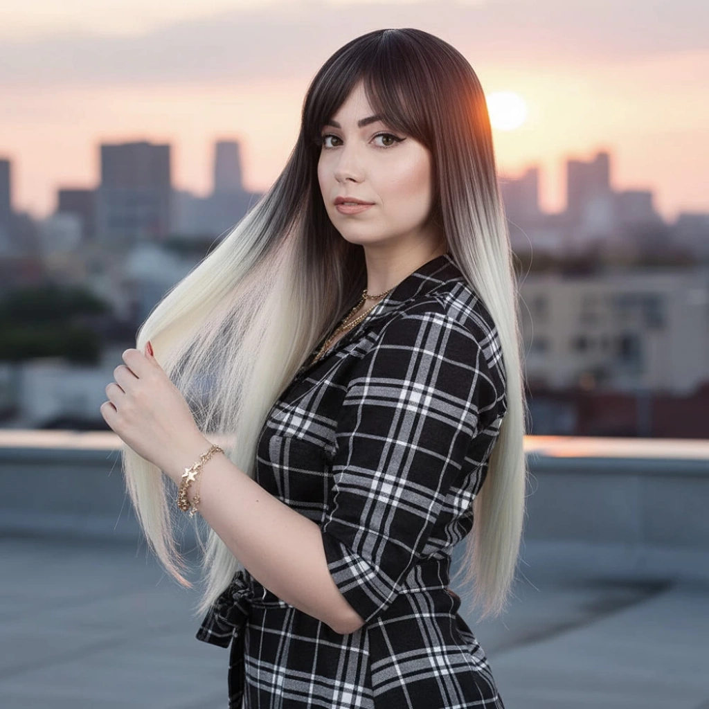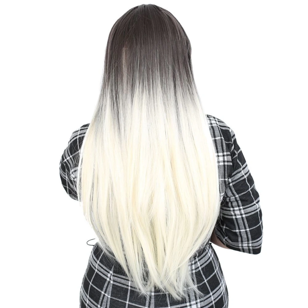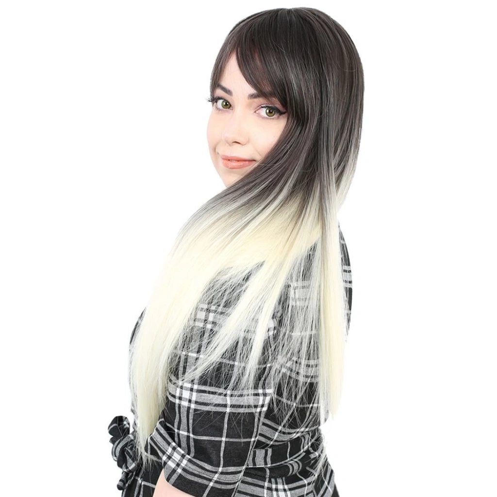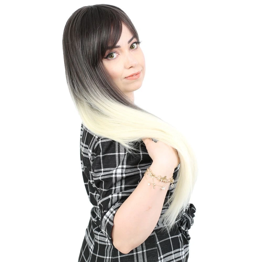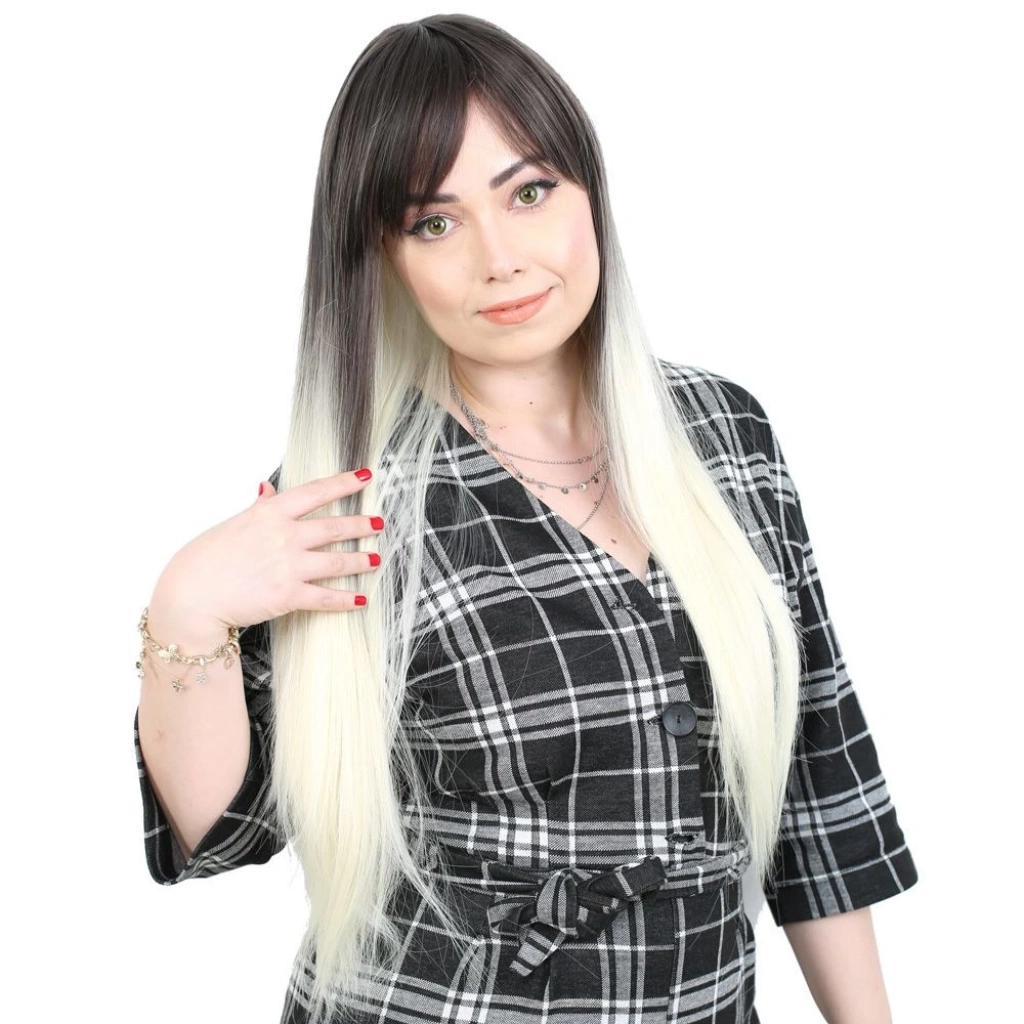 Fiber Sentetik Uzun Düz Kahküllü Peruk - Küllü Siyah / Platin Ombreli
