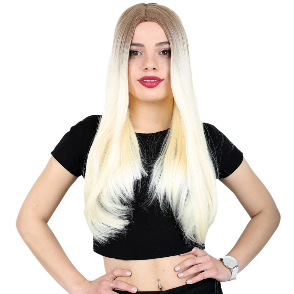 Fiber Sentetik Uzun Düz Peruk - Açık Balköpüğü / Platin Ombreli