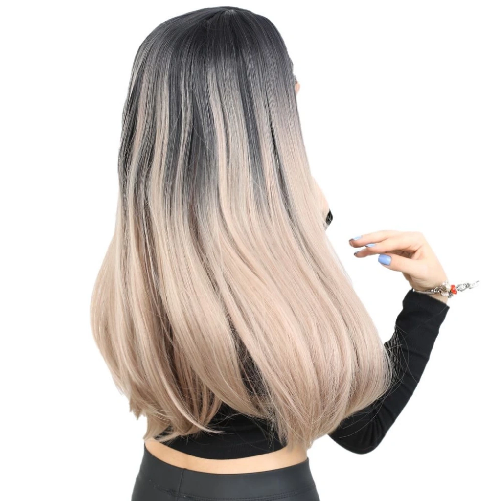 Fiber Sentetik Uzun Düz Peruk - Siyah / Küllü Bebek Sarı Ombreli