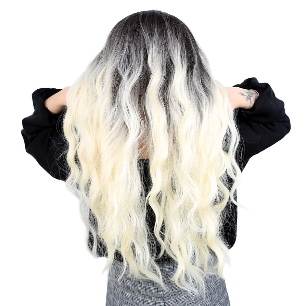 Fiber Sentetik Uzun Su Dalgası Peruk - Açık Siyah / Platin Ombreli
