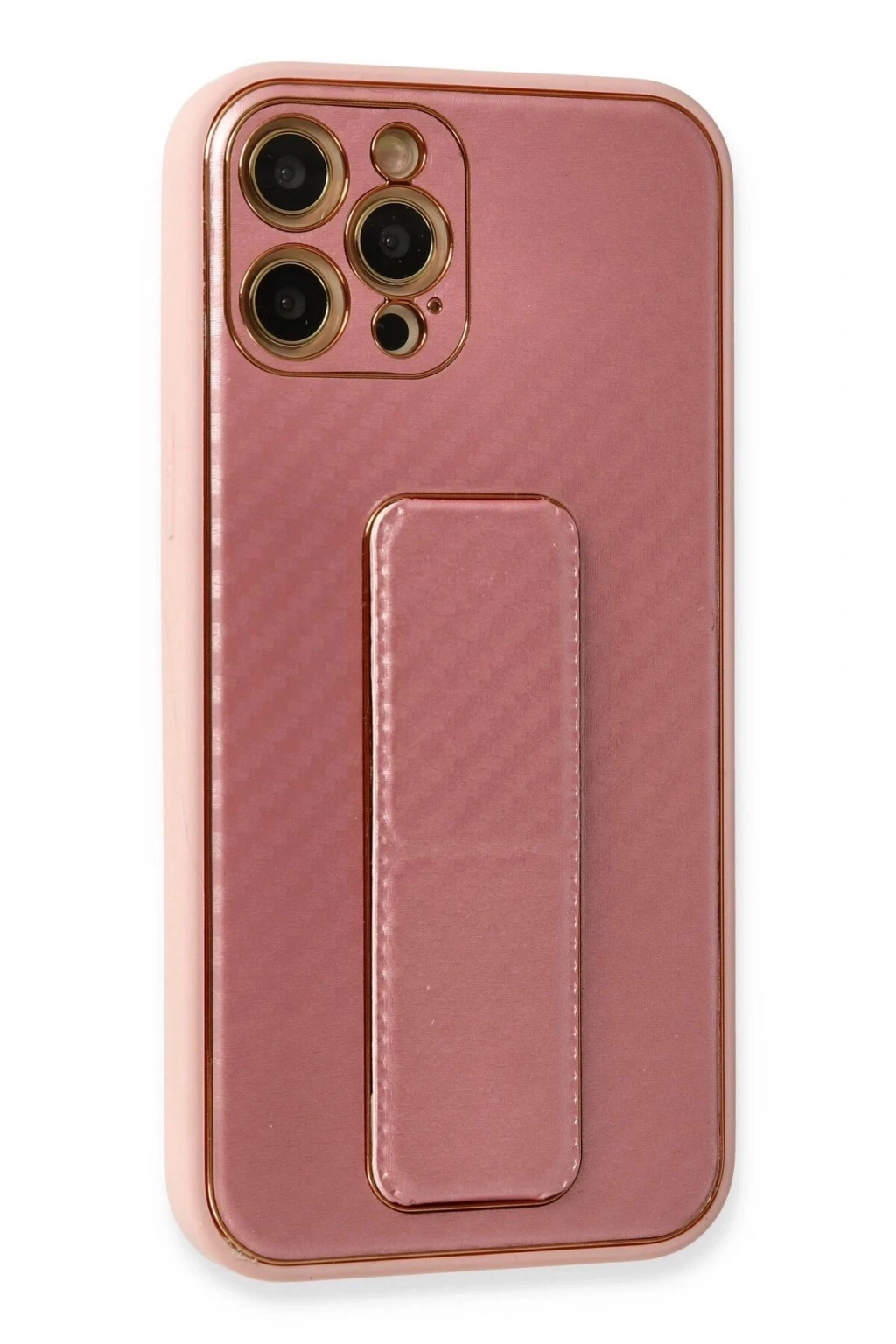 iPhone 12 Pro Kılıf Coco Karbon Standlı Kapak - Pembe
