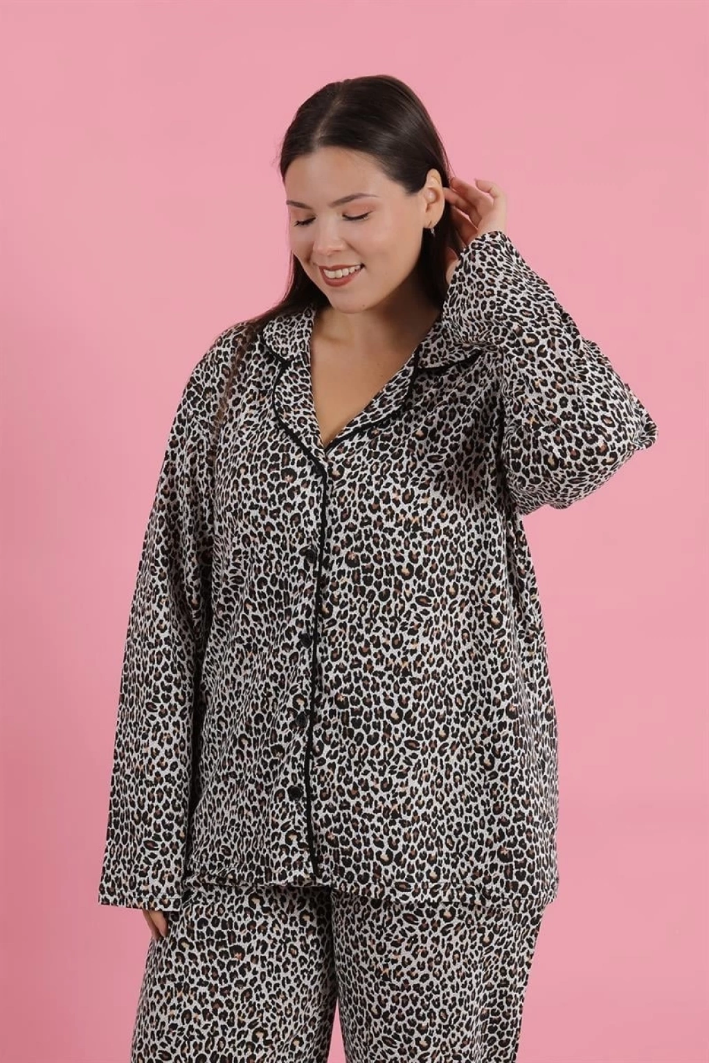 Çamaşır Kenti Kadın Büyük Beden Leopar Desenli Düğmeli Pijama Takımı, rahatlığı ve şıklığı bir arada sunar.