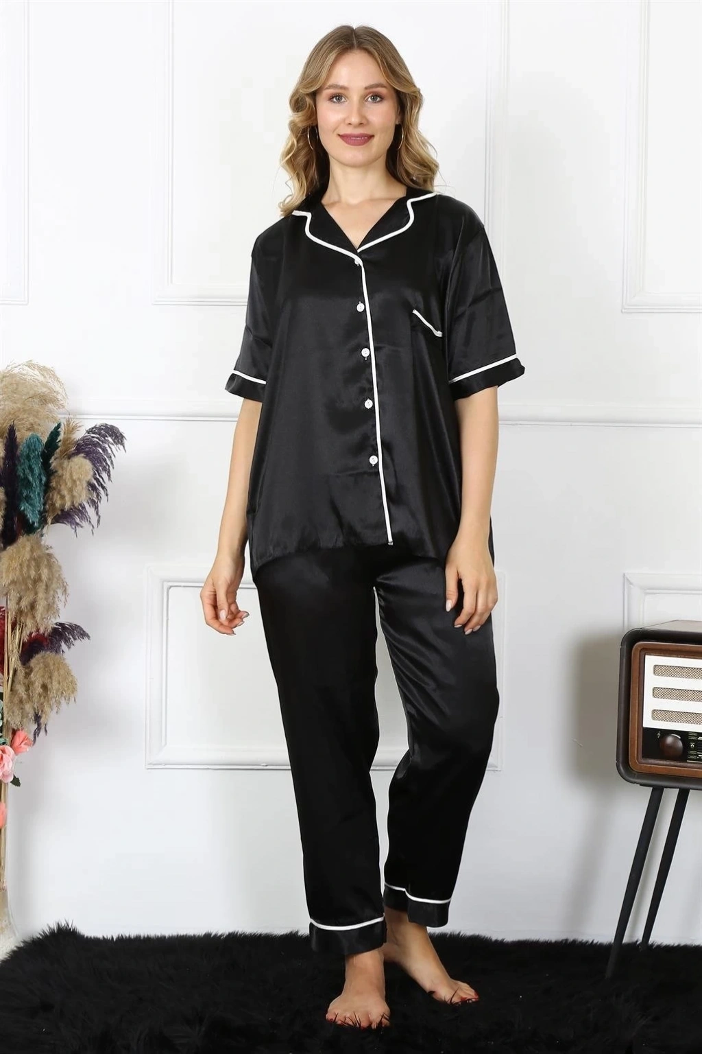 Çamaşır Kenti kadın büyük beden siyah saten pijama takımı, şıklığı ve rahatlığı bir arada sunar.
