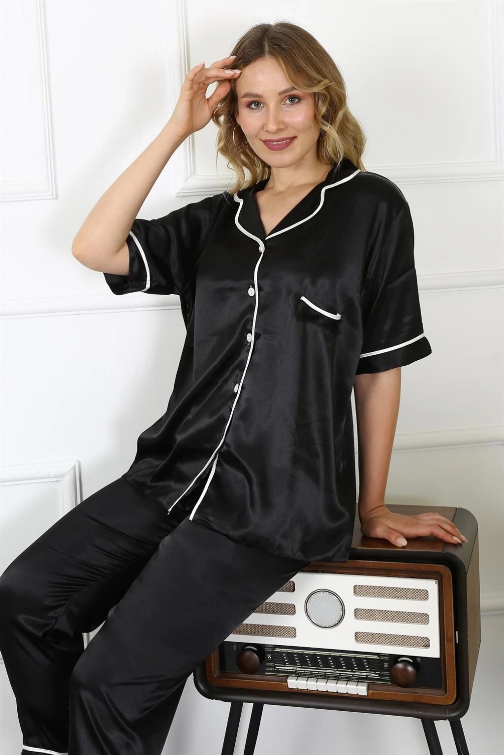 Bu şık siyah saten pijama takımıyla hem gecelerinizde hem de sabahlarınızda rahat edeceksiniz.