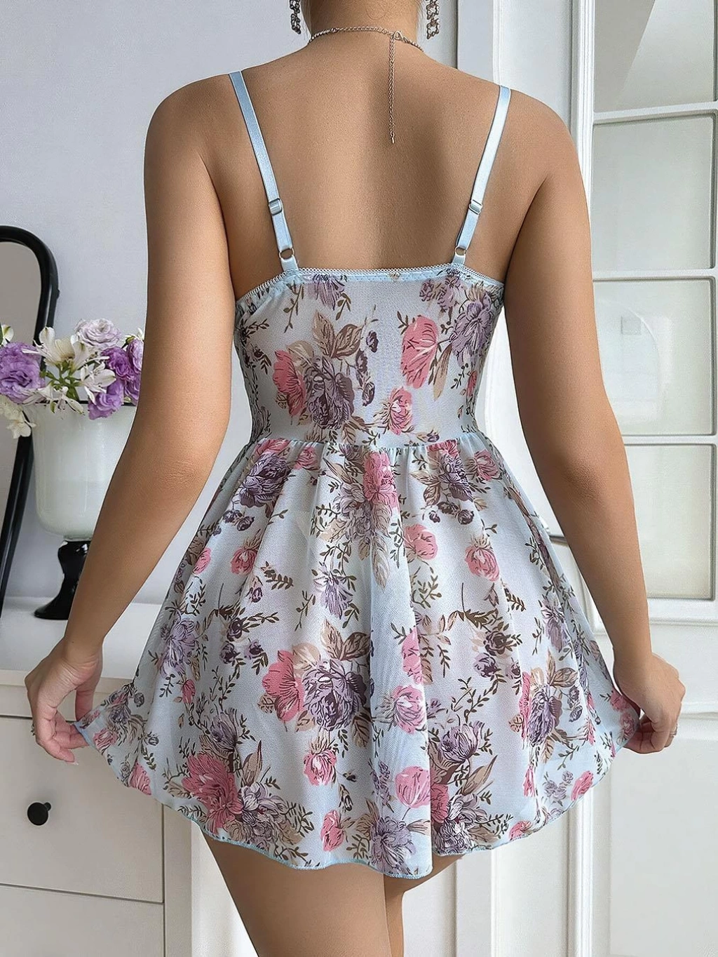 Kadın mavi çiçek desenli fantezi tül gecelik