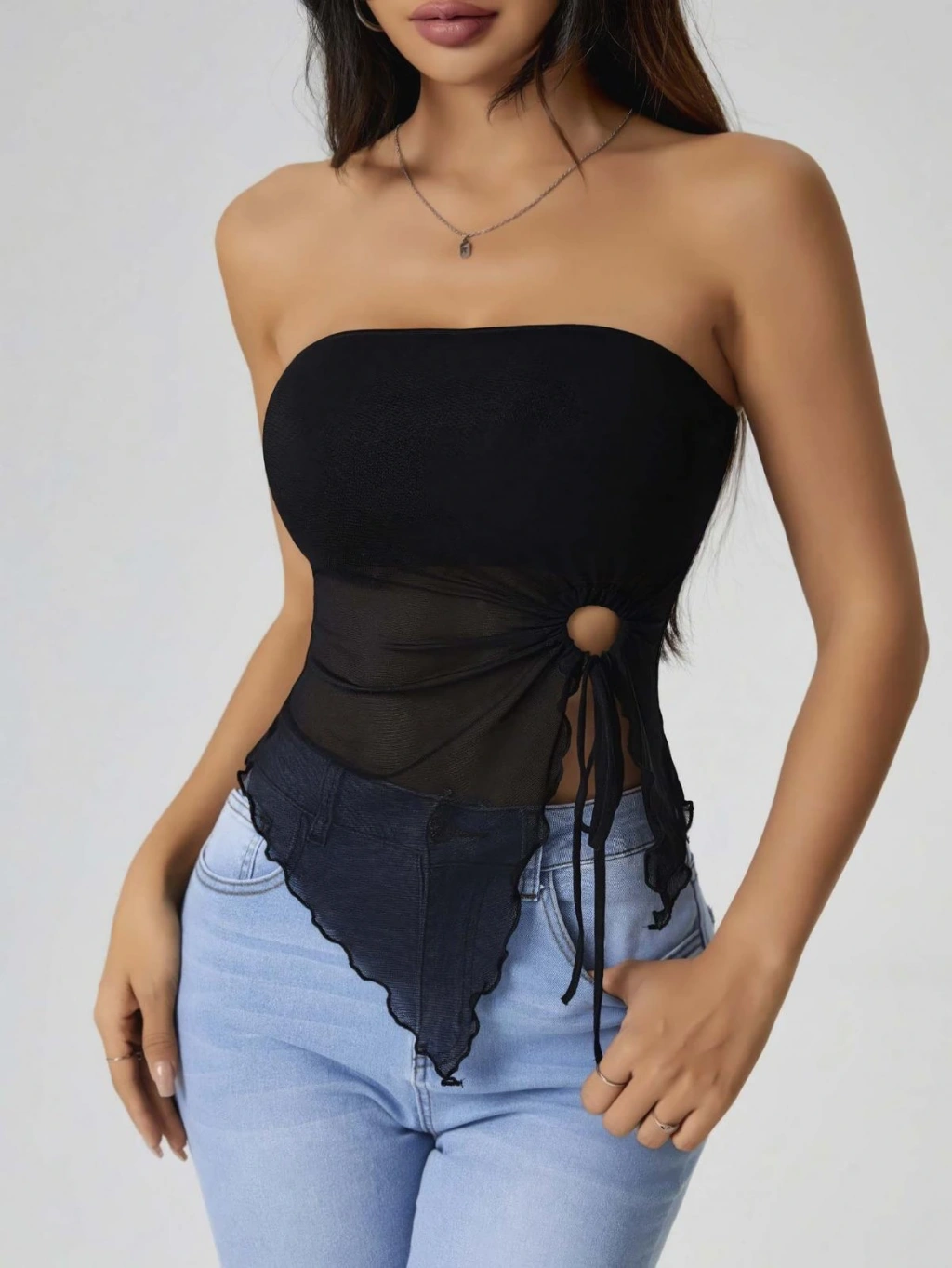 Kadın Siyah Crop Askılı Önden Bağlama Fırfır detaylı 5089