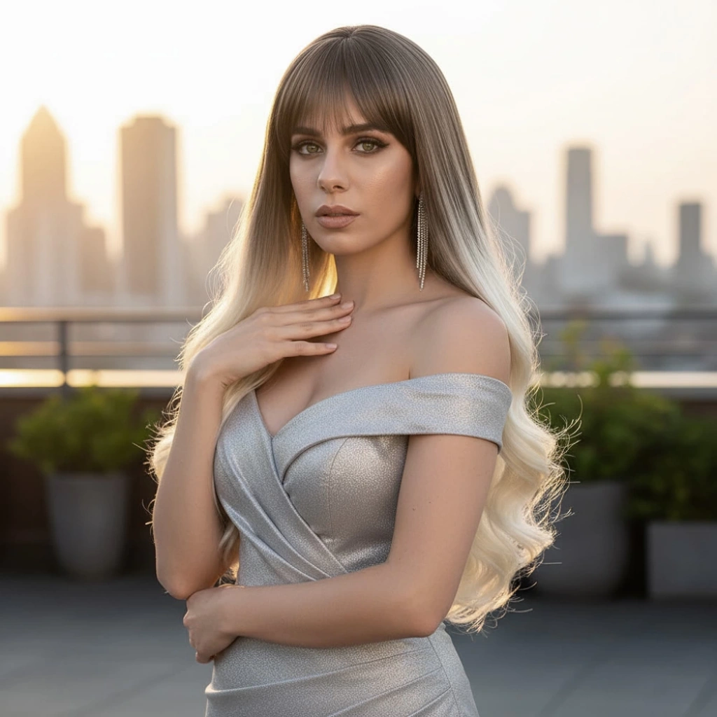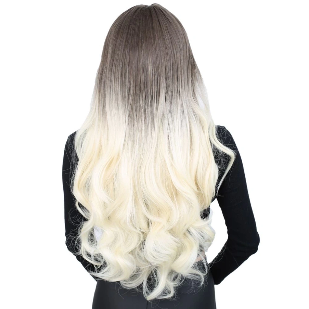 Kahküllü Uzun Dalgalı Fiber Sentetik Peruk - Küllü Açık Kahve / Platin Ombreli