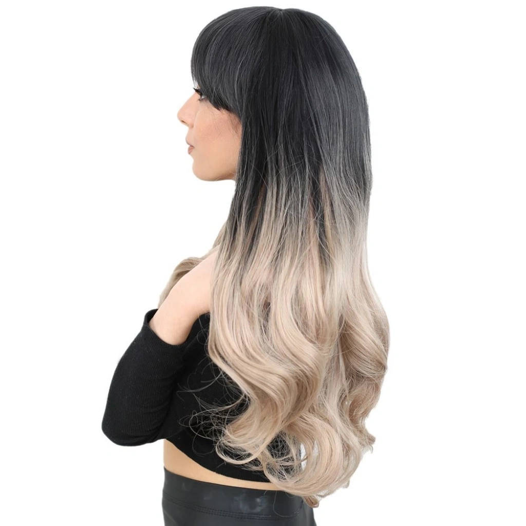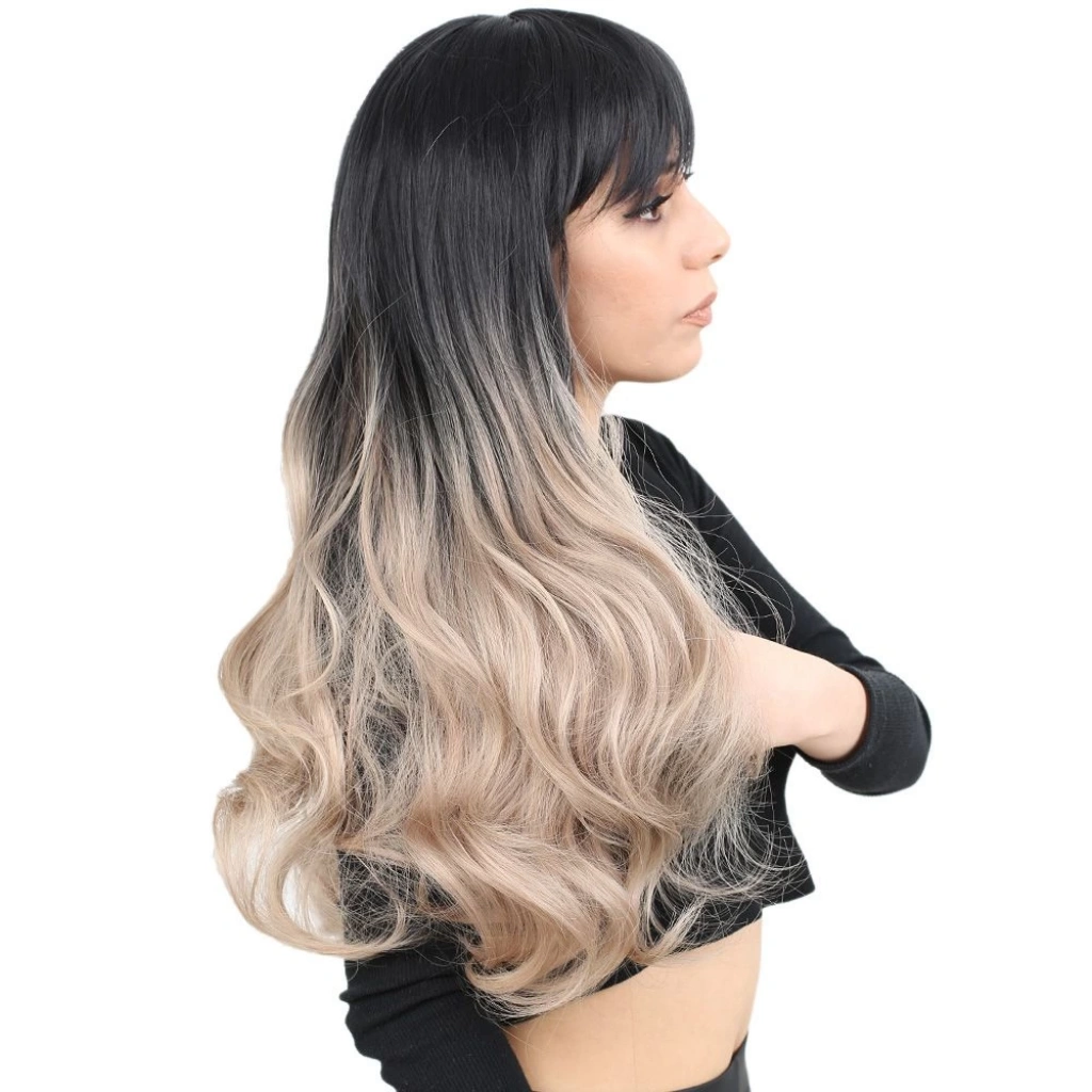 Kahküllü Uzun Dalgalı Fiber Sentetik Peruk - Siyah / Küllü Bebek Sarı  Ombreli