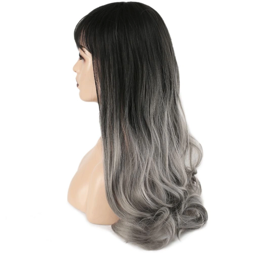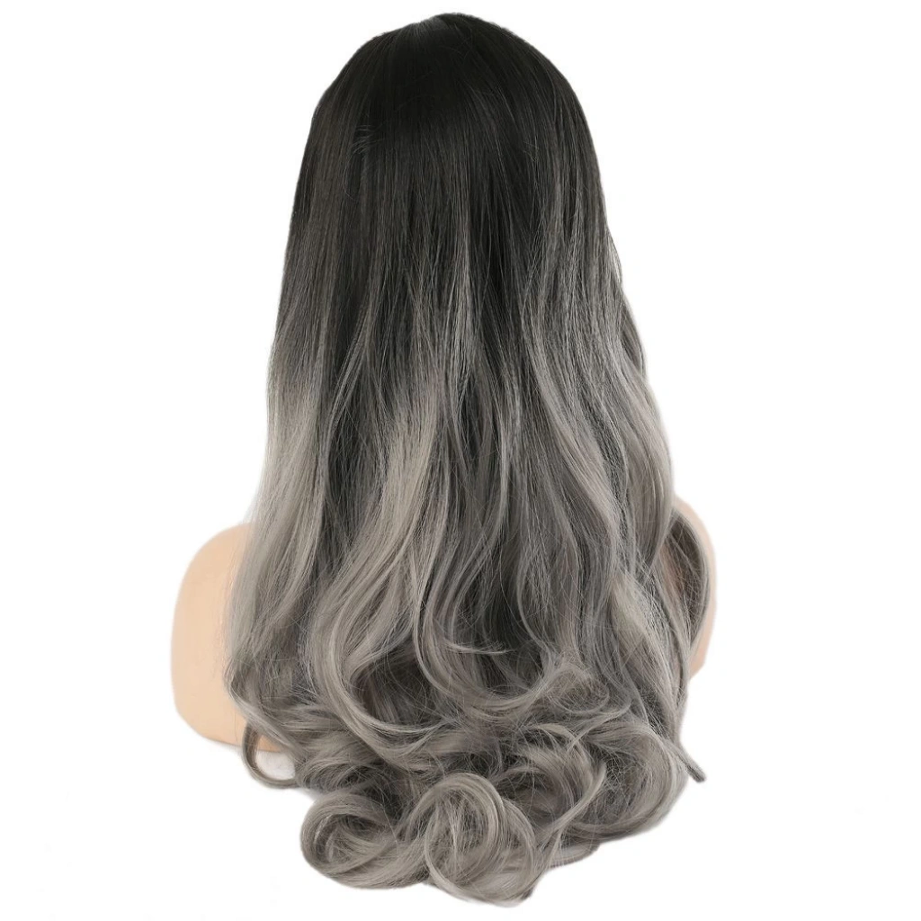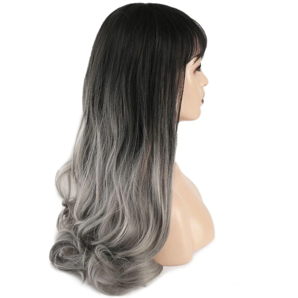 Kahküllü Uzun Dalgalı Fiber Sentetik Peruk - Siyah Gri Ombreli