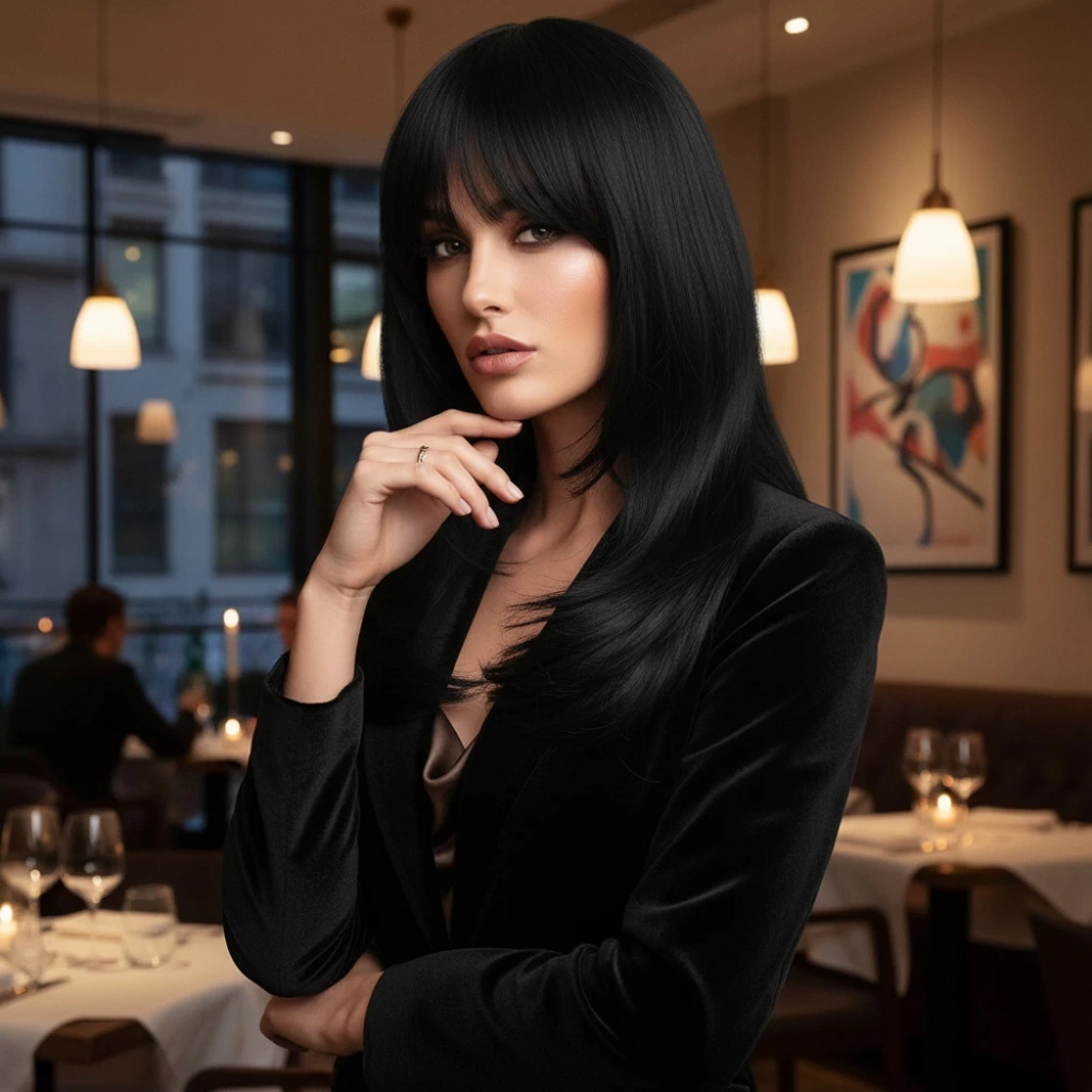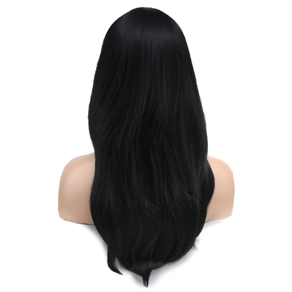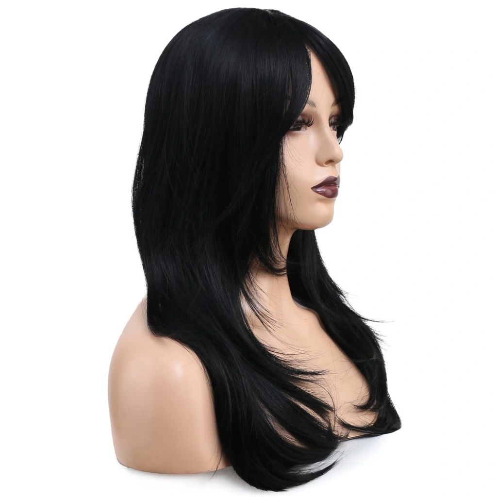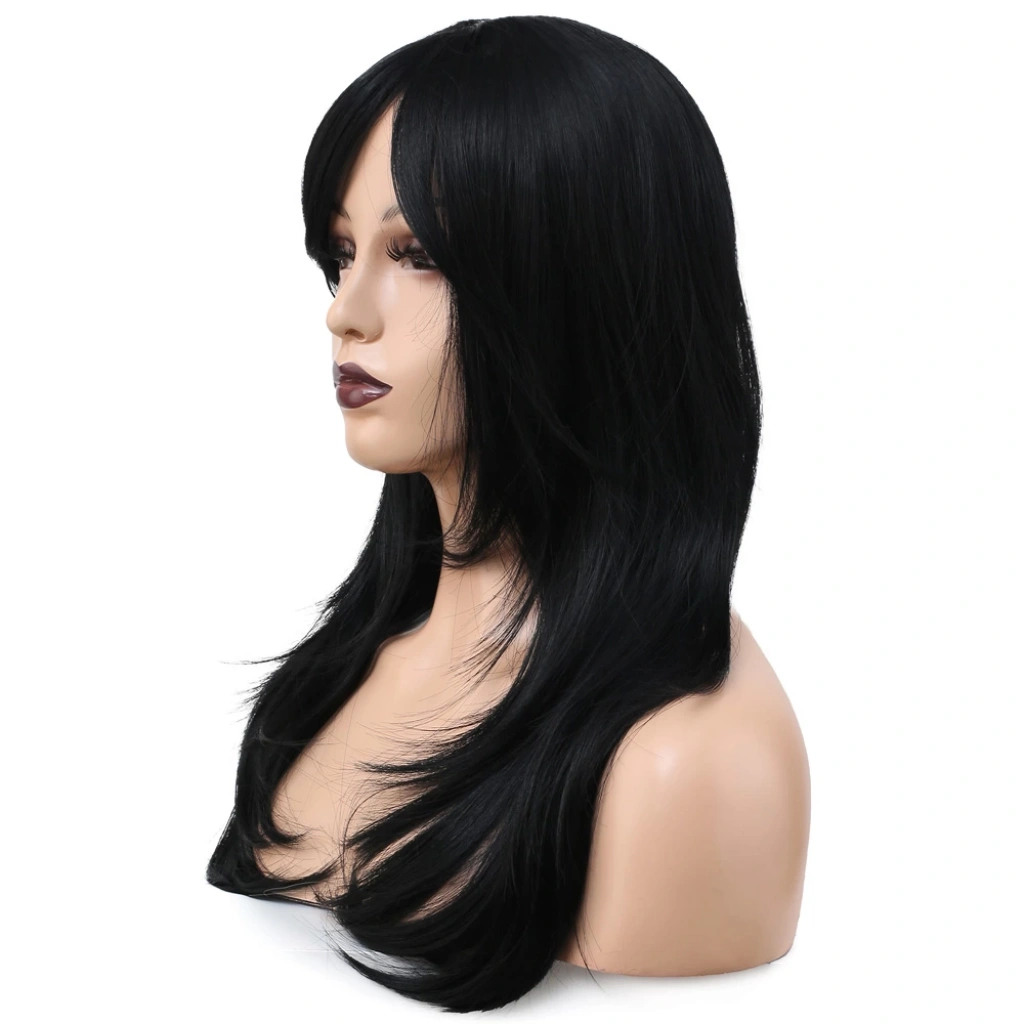 Katlı Kesim Perçemli Düz Fiber Sentetik Orta Boy Peruk - Siyah