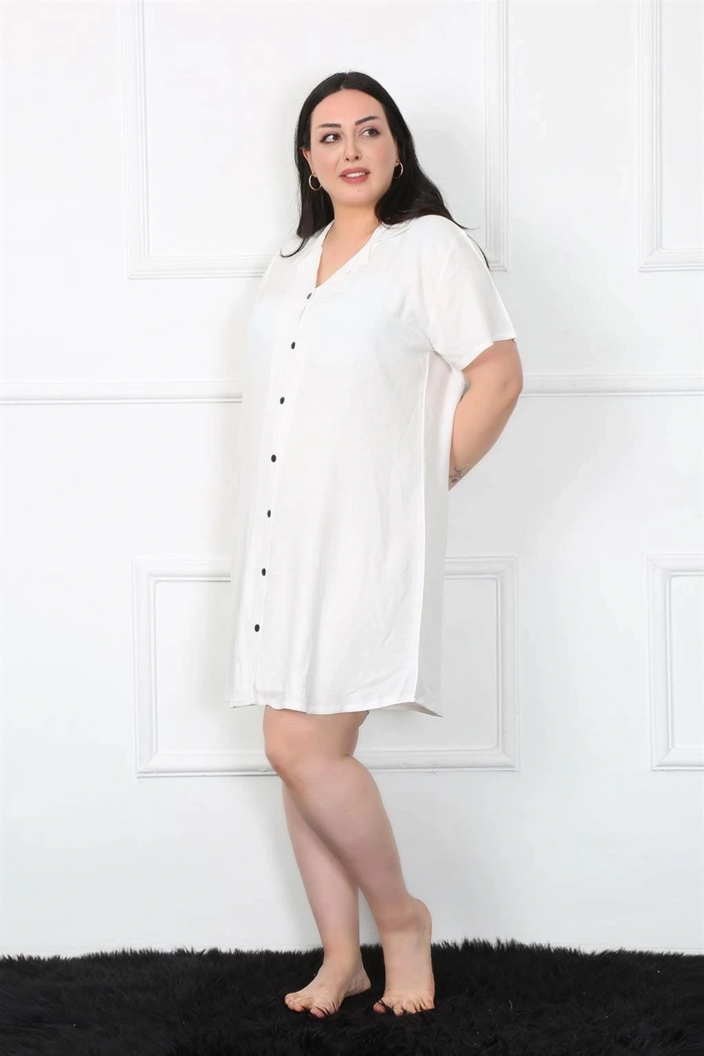 Çamaşır Kenti Büyük Beden Dokuma Düğmeli Beyaz Tunik Gecelik