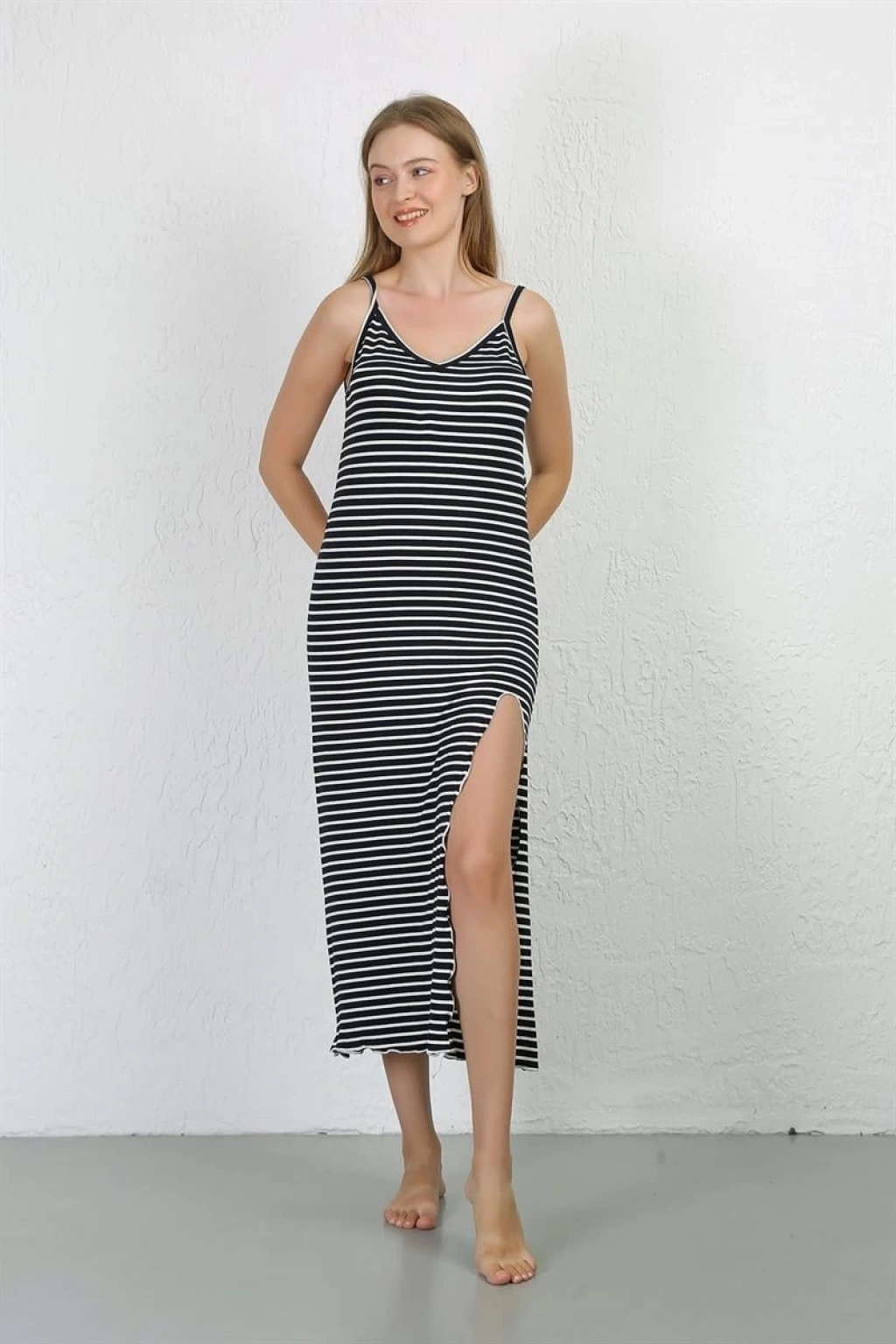 Bu Çamaşır Kenti İp Askılı Uzun Yırtmaçlı Penye Gecelik ile kendinizi özel ve güzel hissedin.