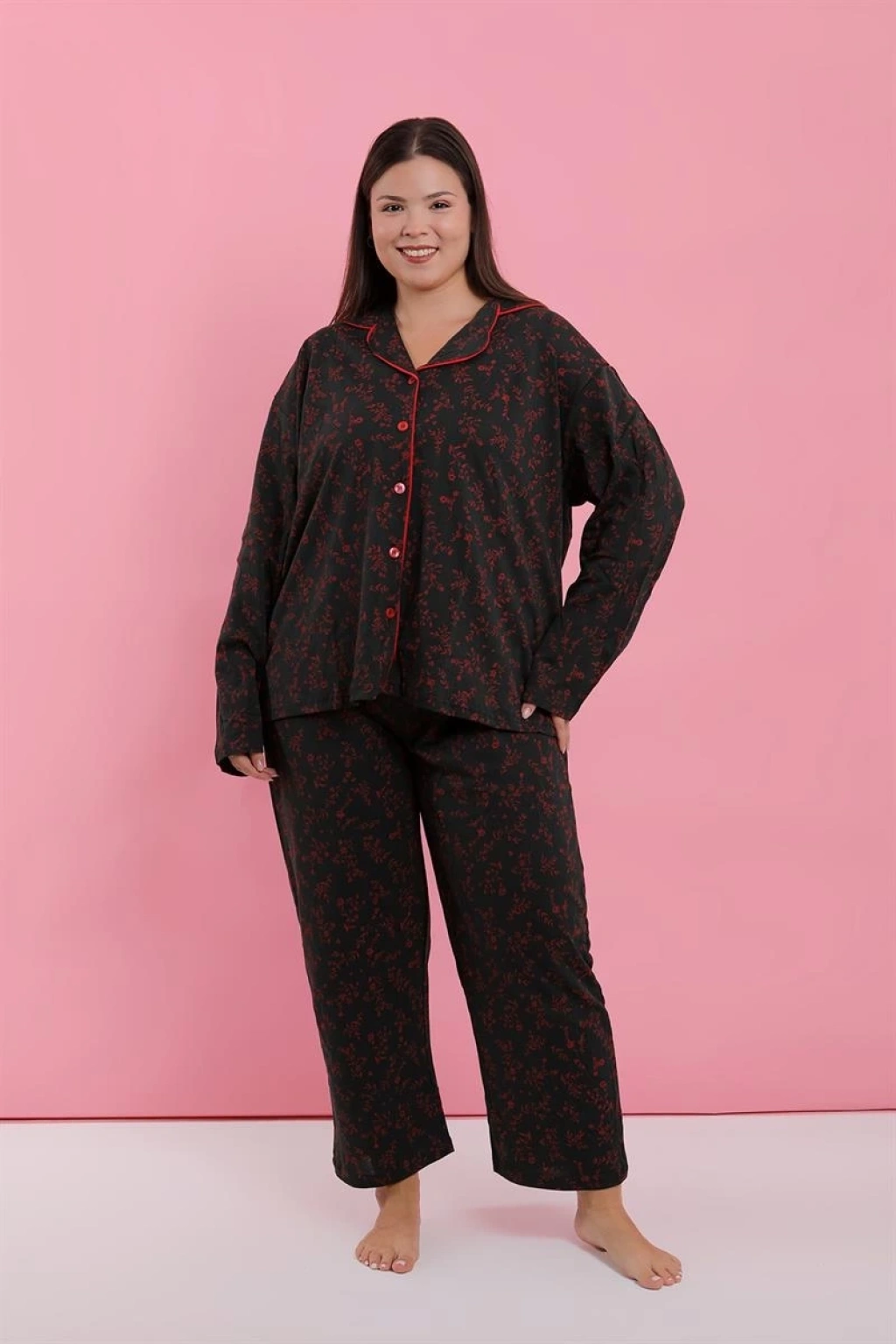 Çamaşır Kenti markasının tasarladığı Kadın Büyük Beden Siyah Kırmızı Çiçekli Düğmeli Pijama Takımı, konfor ve şıklığı bir arada sunuyor.