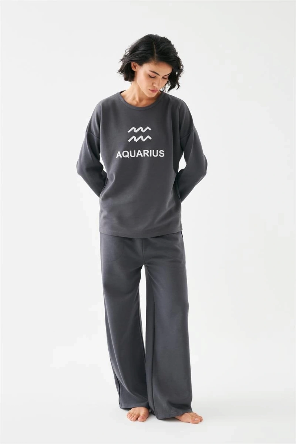 Çamaşır Kenti'nin tasarladığı Kadın Füme Kova Burcu Oversize 2 İplik Eşofman Ev Giyim Takımı, rahatlığı ve şıklığı bir arada sunuyor. Bu harika takım ile hem evde hem de dışarıda şık ve rahat bir görünüm elde edebilirsiniz.