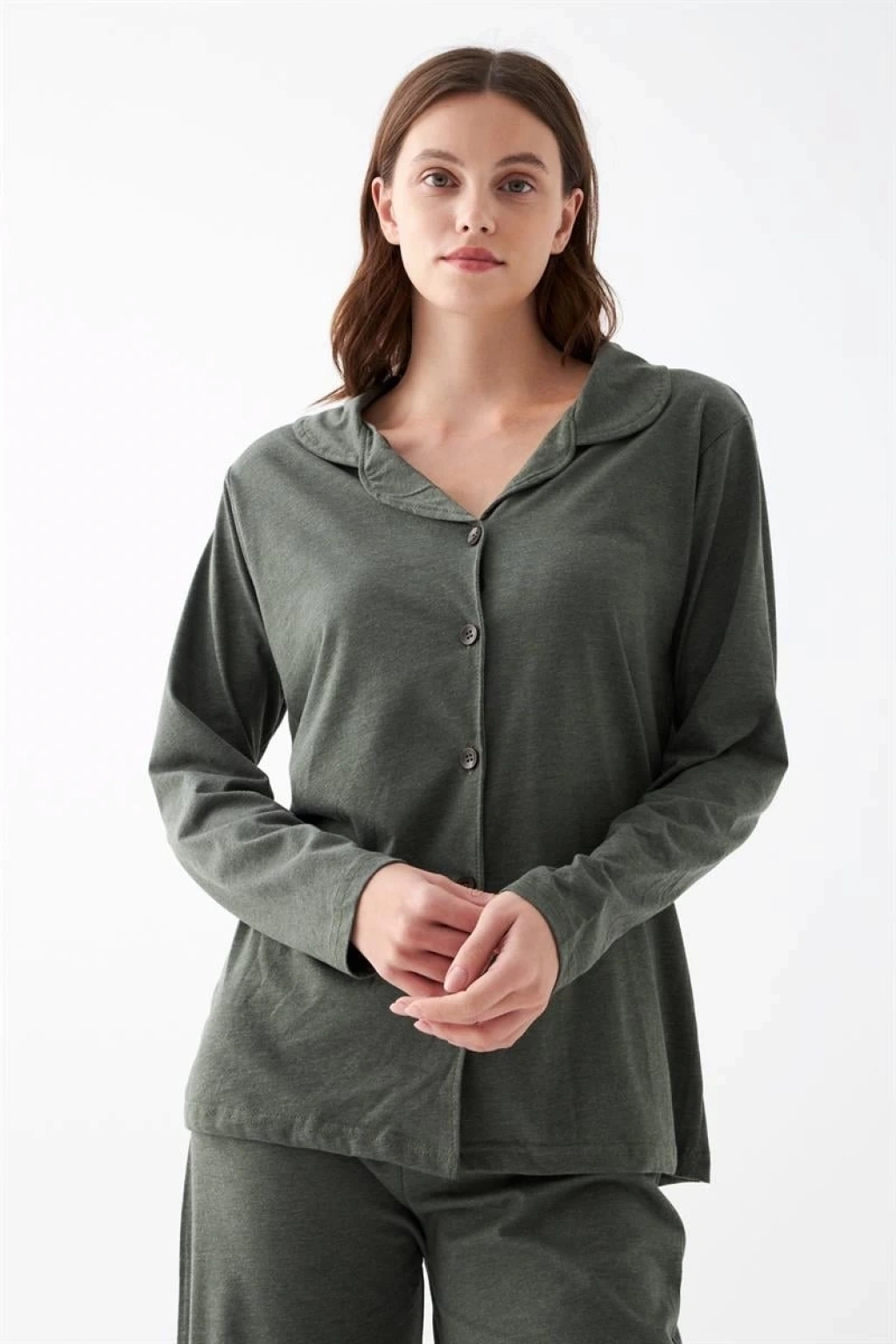 Çamaşır Kenti Kadın Haki Düğmeli Pamuklu Pijama Takımı ile şıklığı ve konforu bir arada yaşayın!
