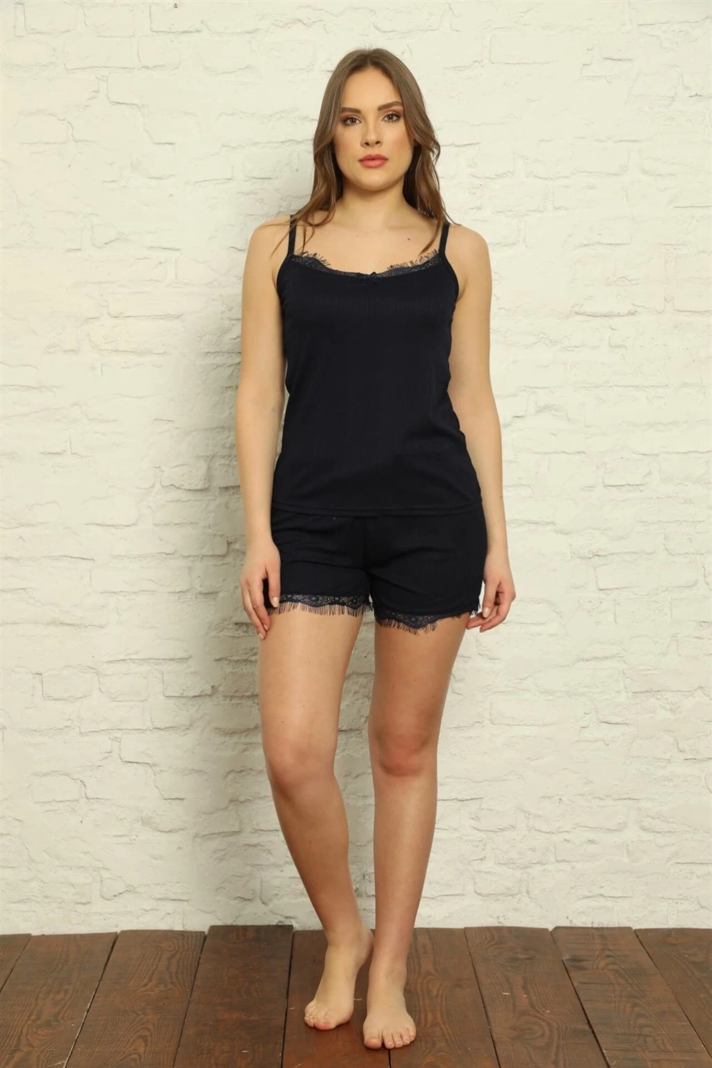 Şıklığı ve konforu bir arada arayan kadınların tercihi olan Çamaşır Kenti Kadın İp Askılı Şortlu Pijama Takım Lacivert'i hemen inceleyin!
