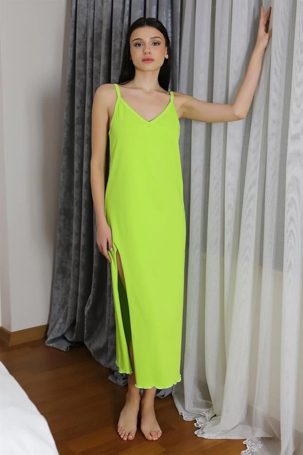 Çamaşır Kenti'nin tasarladığı Kadın İp Askılı Uzun Yırtmaçlı Pamuk Penye Gecelik Kahve, şıklığı ve rahatlığı bir arada sunuyor.
