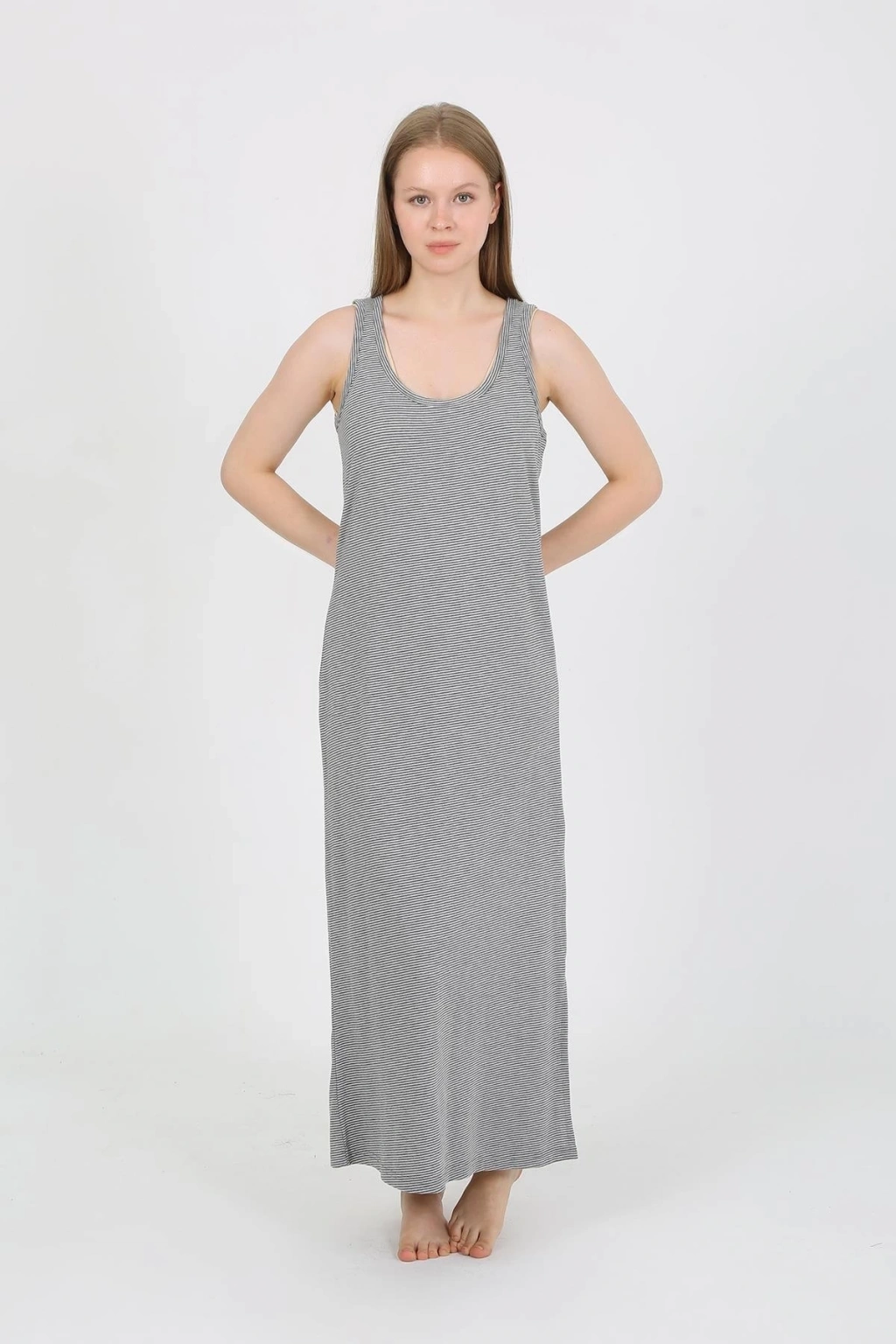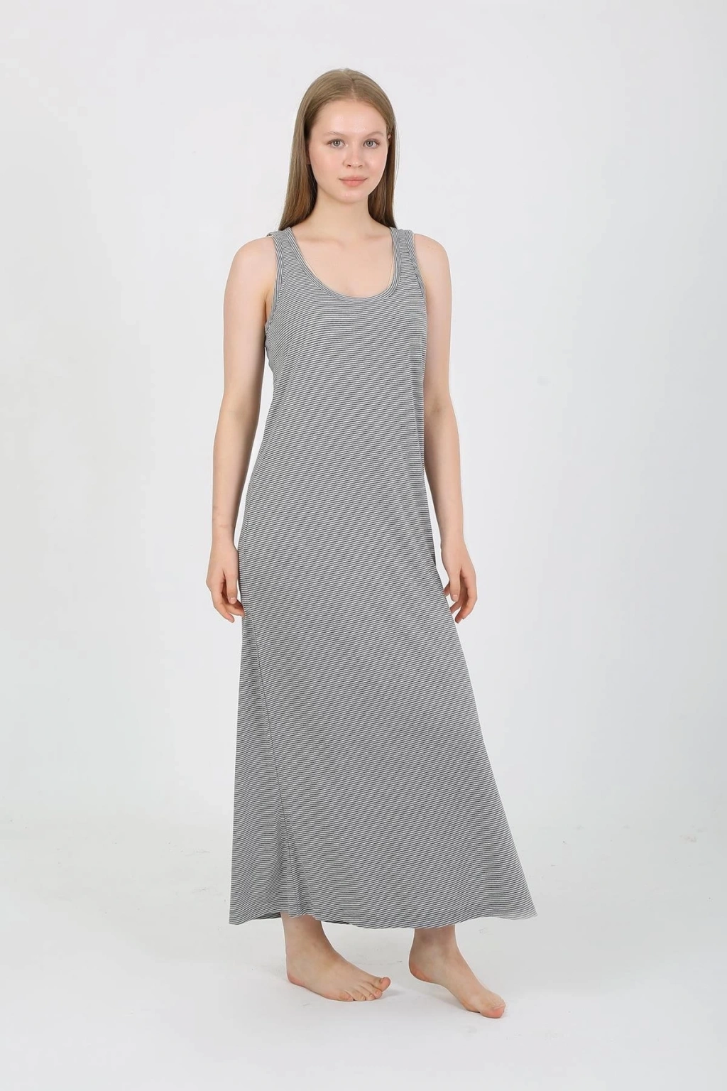 Çamaşır Kenti Kalın Askılı Yırtmaçlı Uzun Gri Gecelik ile hem güzel hem de rahat hissedin!