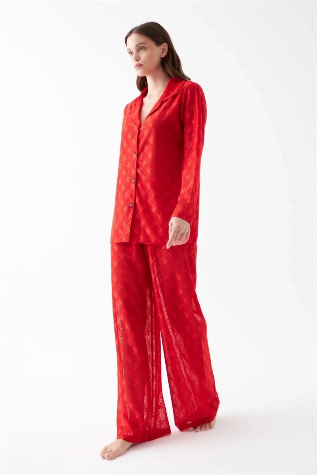 Çamaşır Kenti'nin şık ve rahat tasarımıyla öne çıkan Kadın Kırmızı Şeffaf Jakar Düğmeli Pijama Takımı, gecelerinizi daha keyifli hale getirecek.