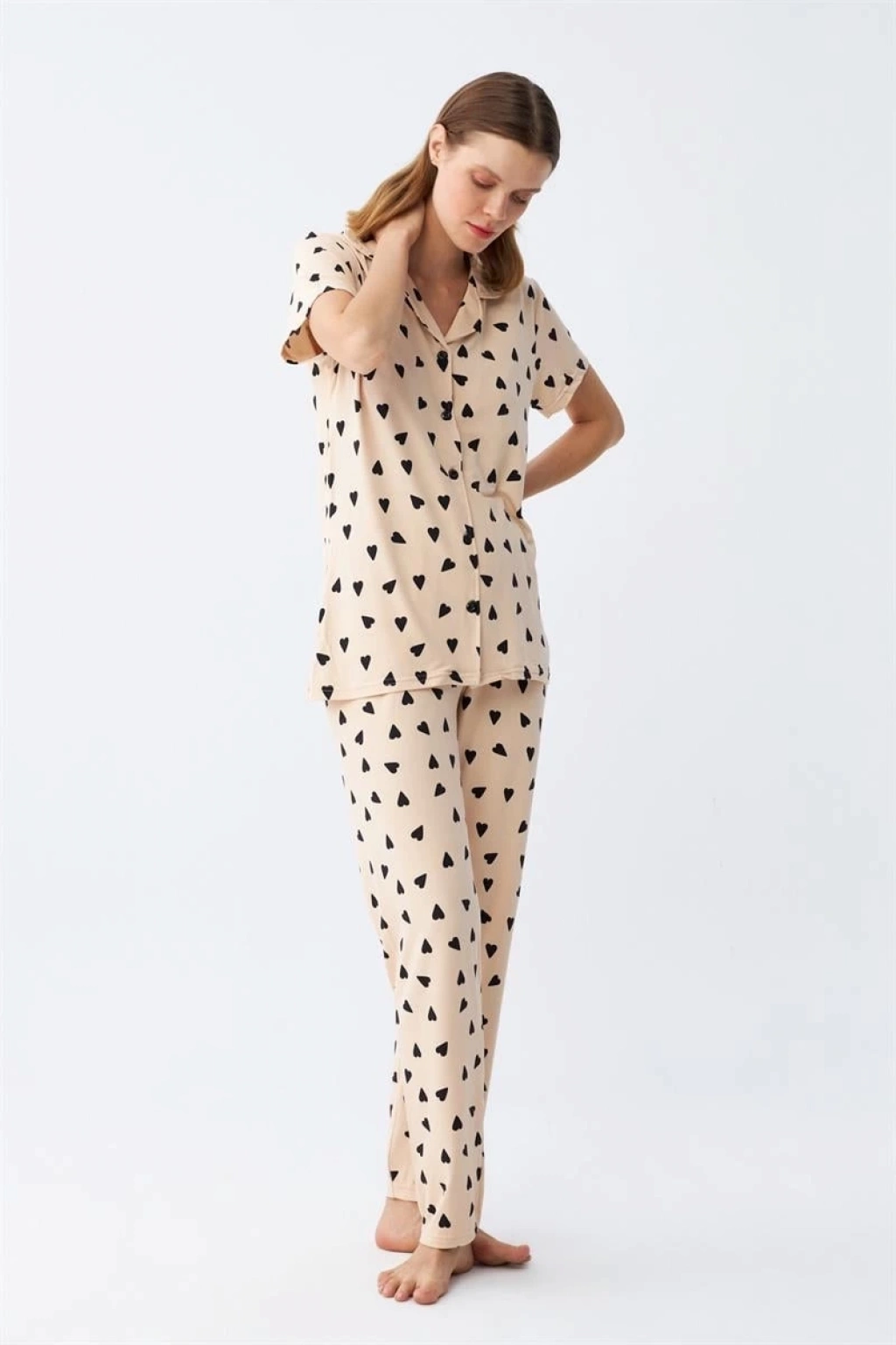 Çamaşır Kenti markasının özel tasarımı olan Kadın Krem Rengi Kalp Desenli Önden Düğmeli Pijama Takımı, kullanışlı ve şık bir seçenektir.