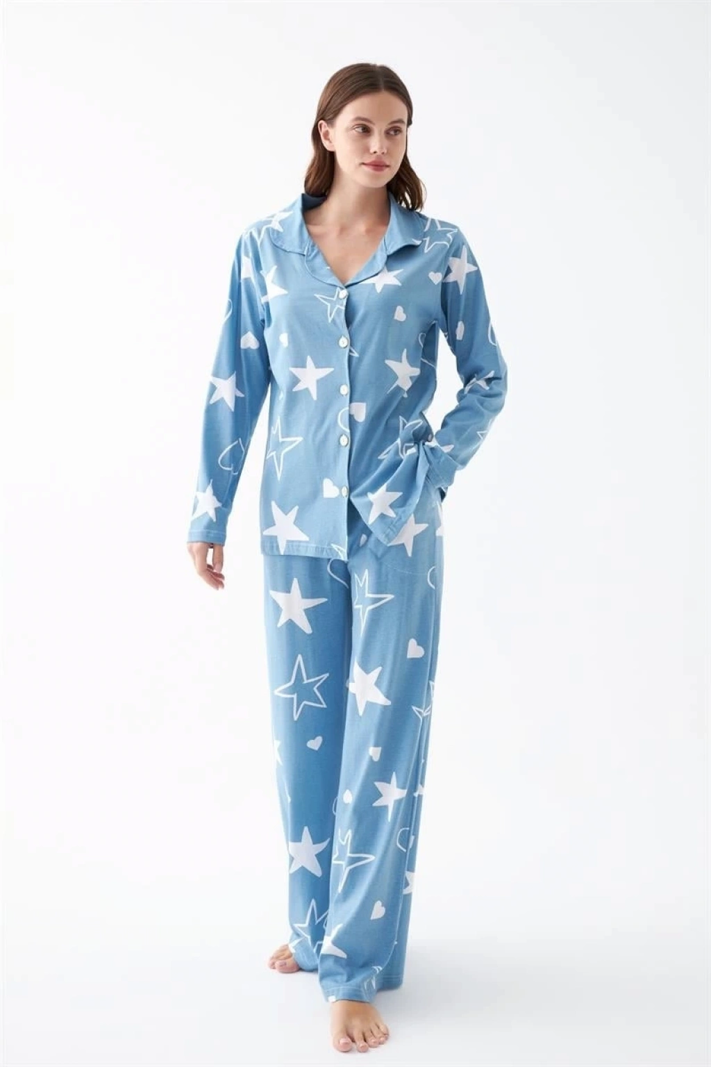 Kadın Mavi Yıldız Desenli Düğmeli Pamuklu Pijama Takımı ile konforlu ve şık bir uyku deneyimi yaşamak artık çok daha kolay!