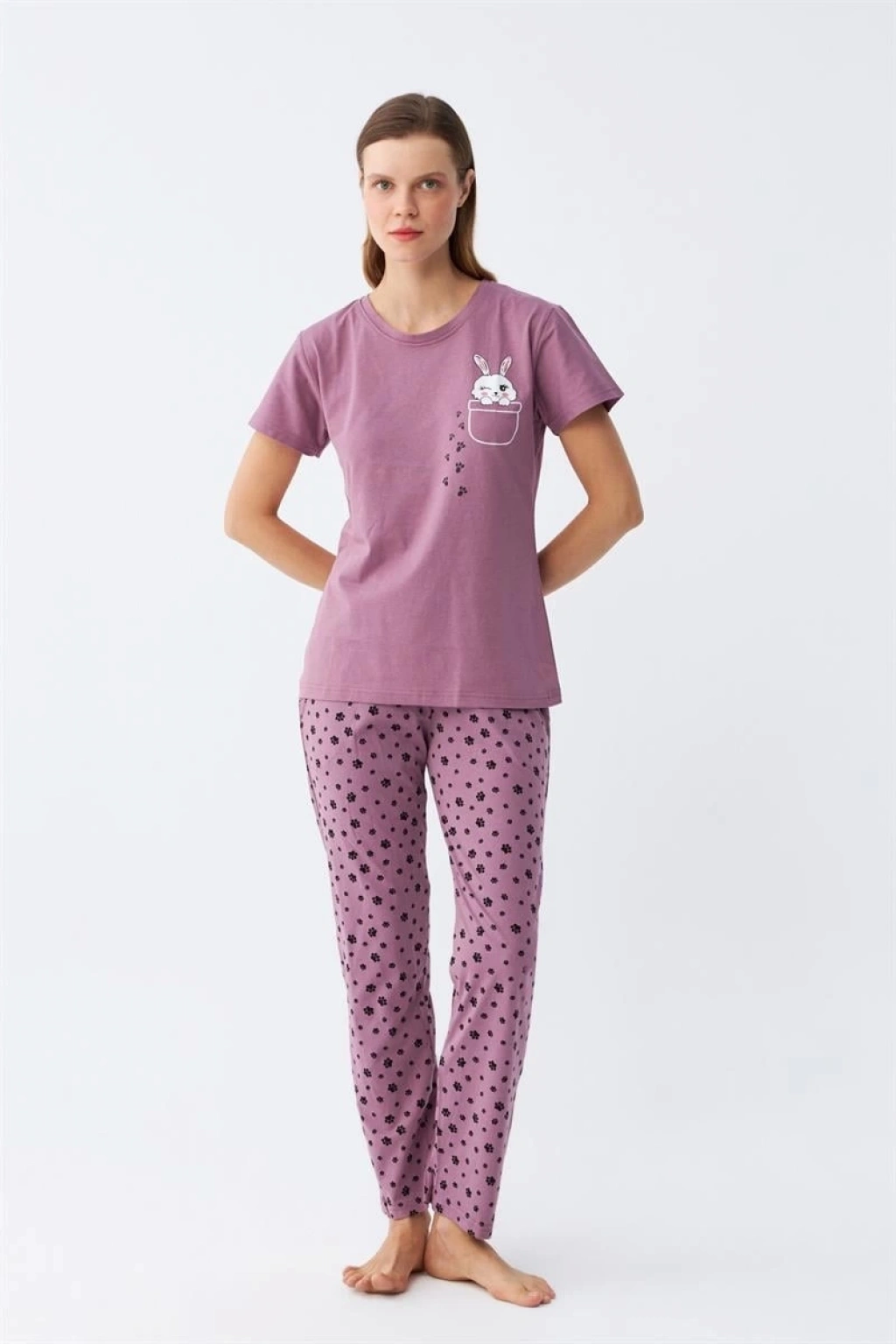 Kadın Mor Patili Tavşan Baskılı Cepli Pijama Takımı, günlük kullanıma uygun ve yıkanabilir özellikleriyle de dikkat çekiyor. Şimdi sipariş vererek bu şık ve konforlu pijama takımına sahip olabilirsiniz.