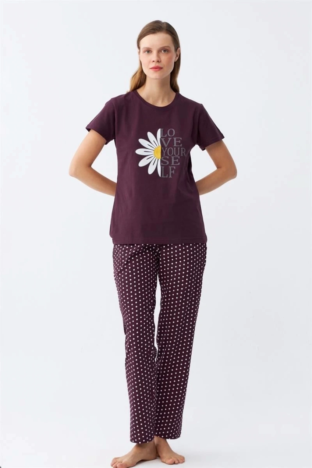 MARSiLYAN- Kadın Mürdüm Papatya Baskılı Kısa Kollu Penye Pijama Takımı