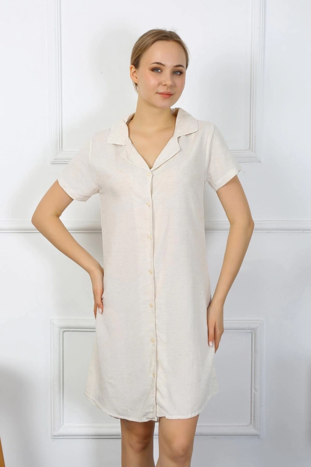 Çamaşır Kenti markasının şık tasarımıyla öne çıkan Pamuk Keten Kısa Kol Düğmeli Krem Tunik Gecelik, rahatlığı ve şıklığı bir arada sunuyor.