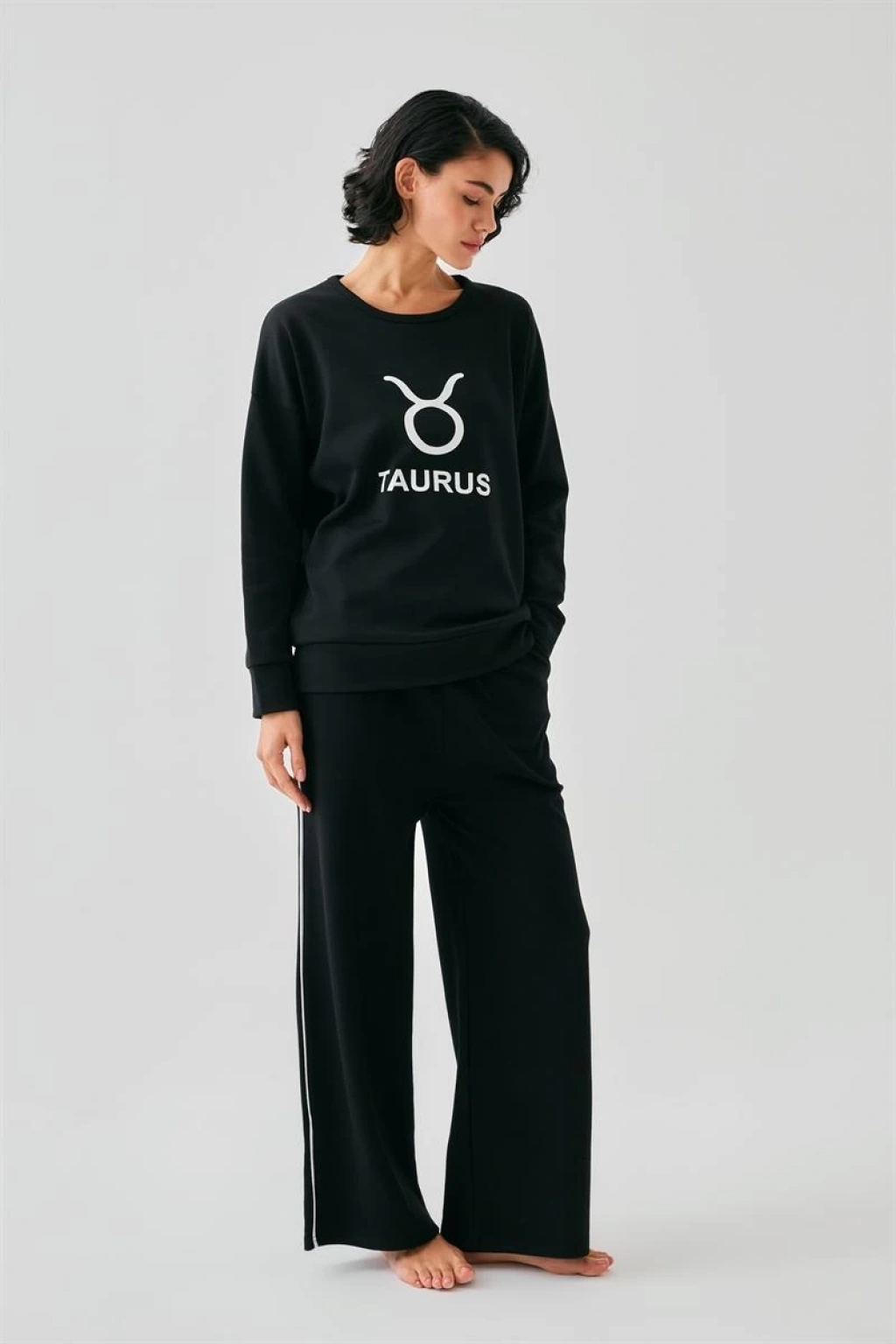 Kadın Siyah Boğa Burcu Oversize 2 İplik Eşofman Ev Giyim Takımı
