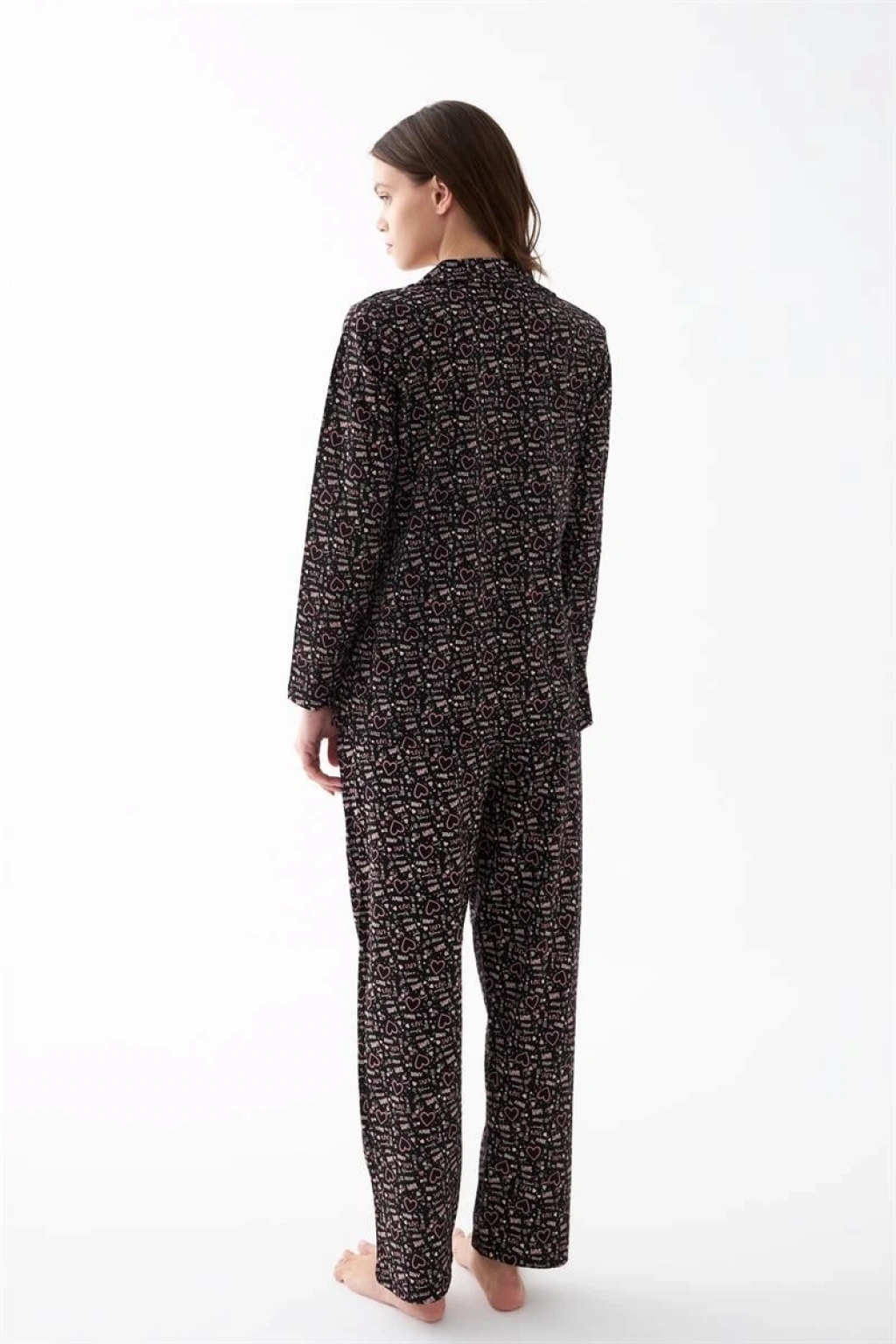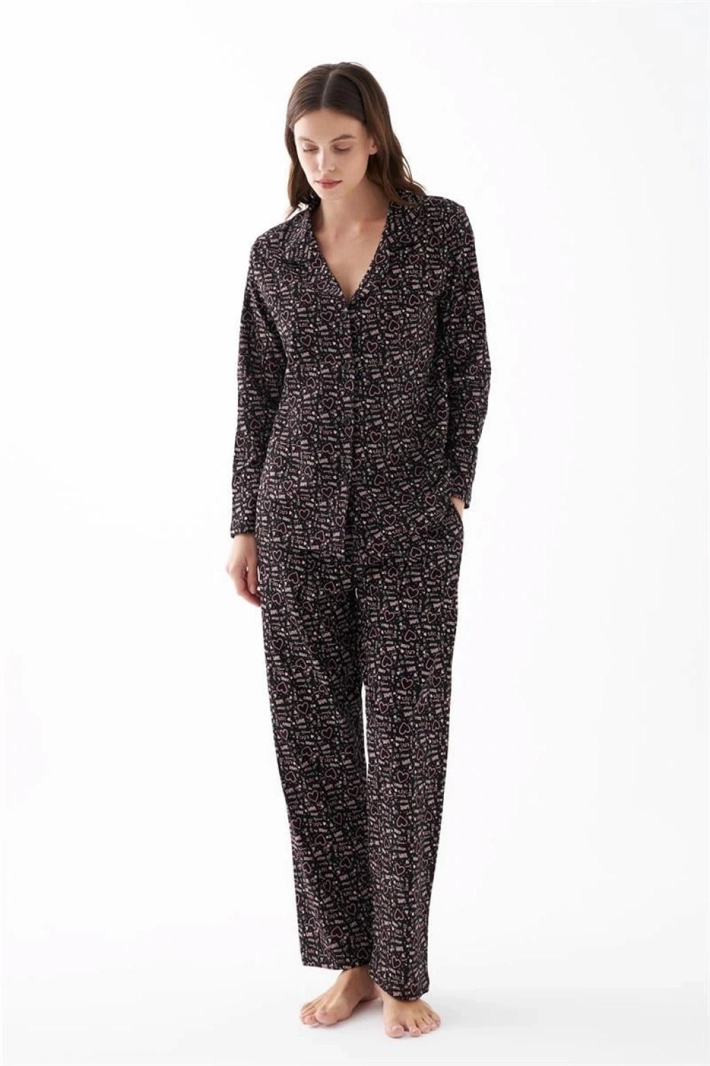 Keyifli ve şık bir gece için Kadın Siyah Düğmeli Kalp Desenli Pamuklu Pijama Takımı tam size göre!