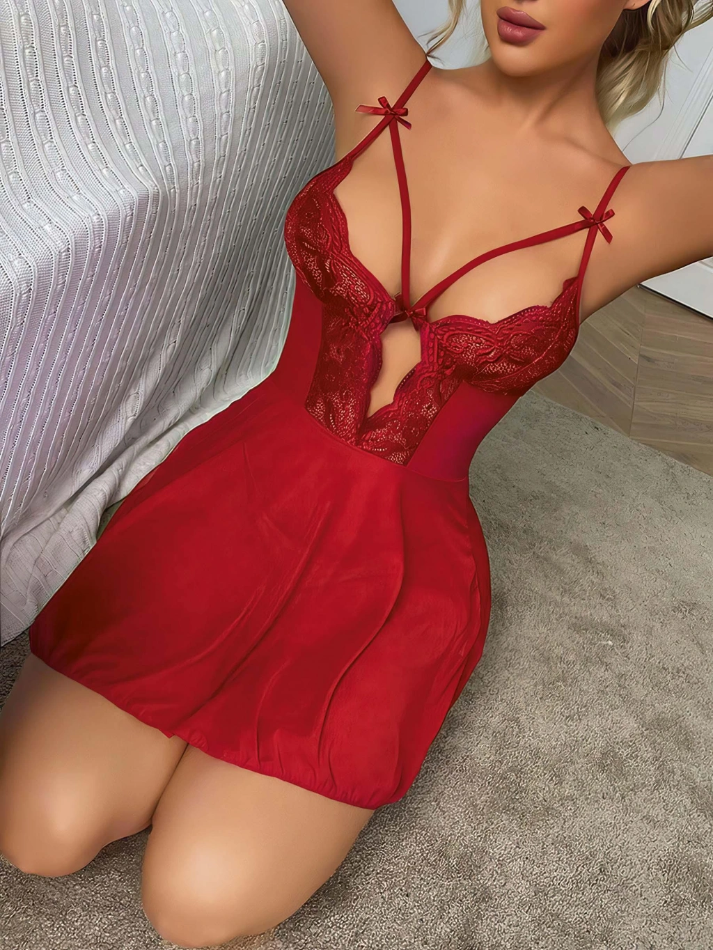 Kırmızı Dantel İşlemeli Fiyonk Detaylı Yanları Dekolteli Fantezi Gecelik