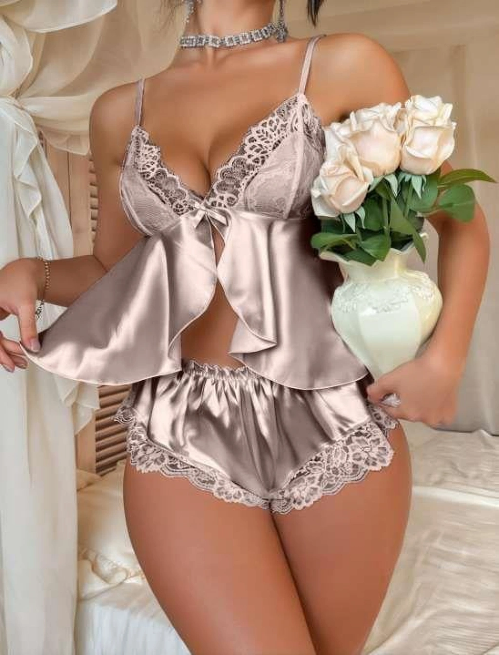Vizon Dantel İşlemeli İnce Askılı Saten Şortlu Takım