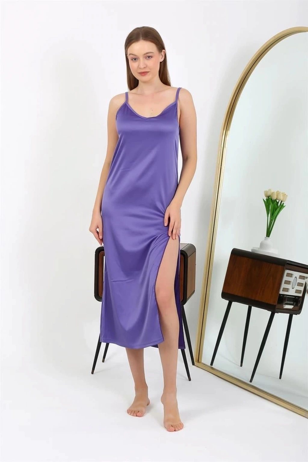 Çamaşır Kenti'nin yepyeni tasarımı olan Yırtmaçlı Uzun Saten Gecelik Mor ile kendinizi şıklığın ve rahatlığın kusursuz uyumuyla ödüllendirin.