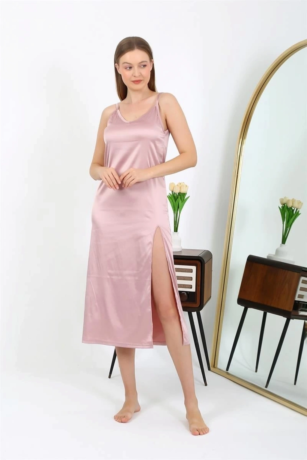 İp Askılı Yırtmaçlı Saten Uzun Gecelik