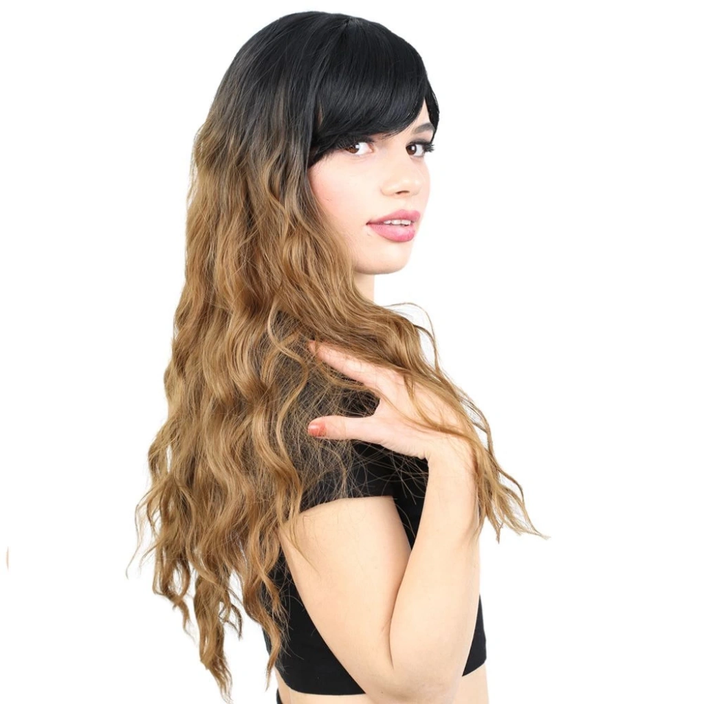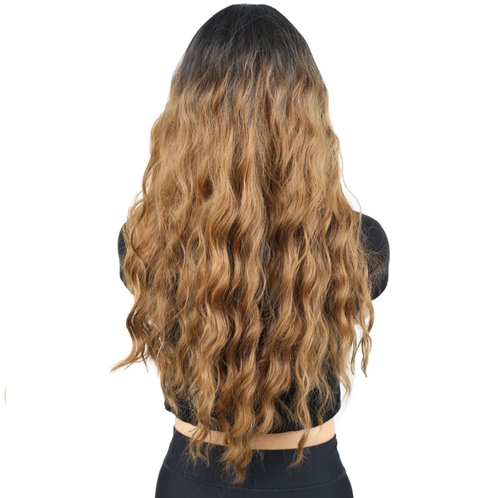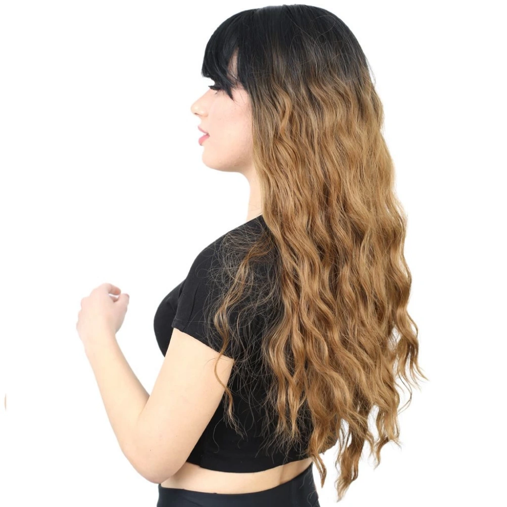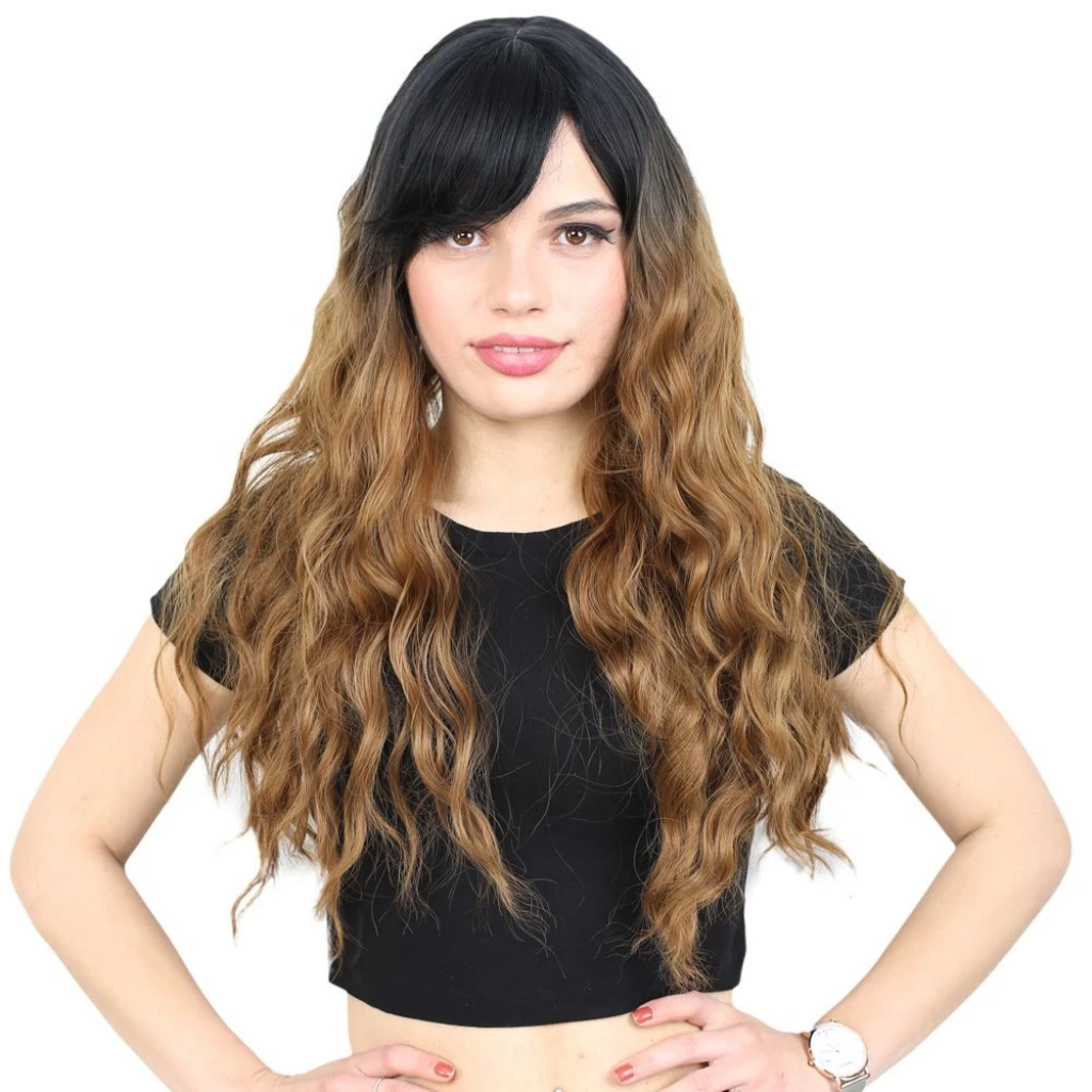 Perçemli Uzun Su Dalgası Fiber Sentetik Peruk- Siyah / Karamel Ombreli