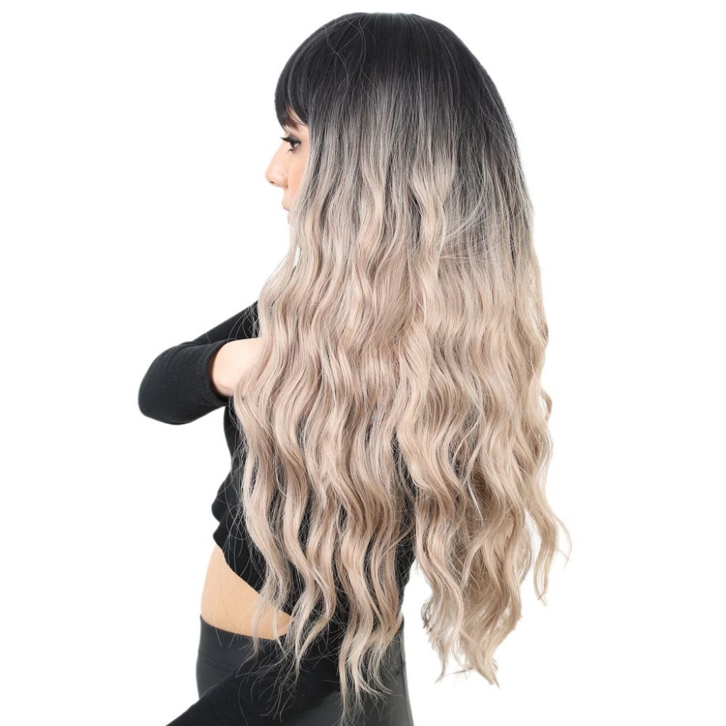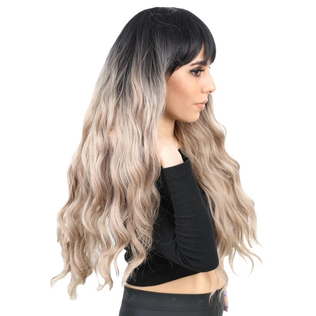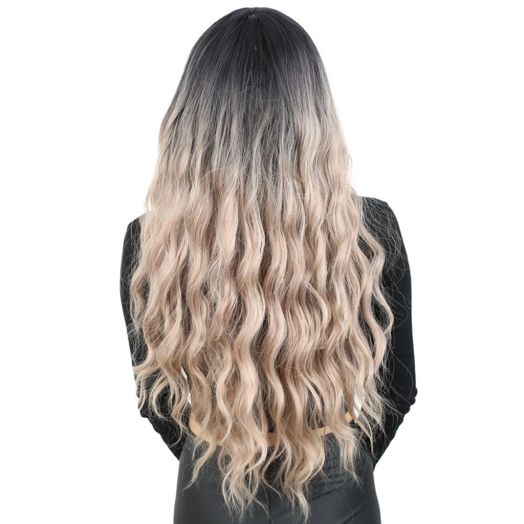 Perçemli Uzun Su Dalgası Fiber Sentetik Peruk- Siyah / Küllü Bebek Sarı Ombreli
