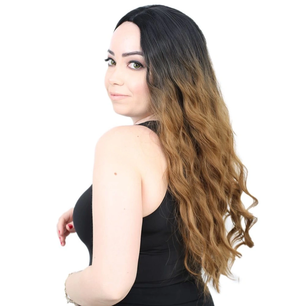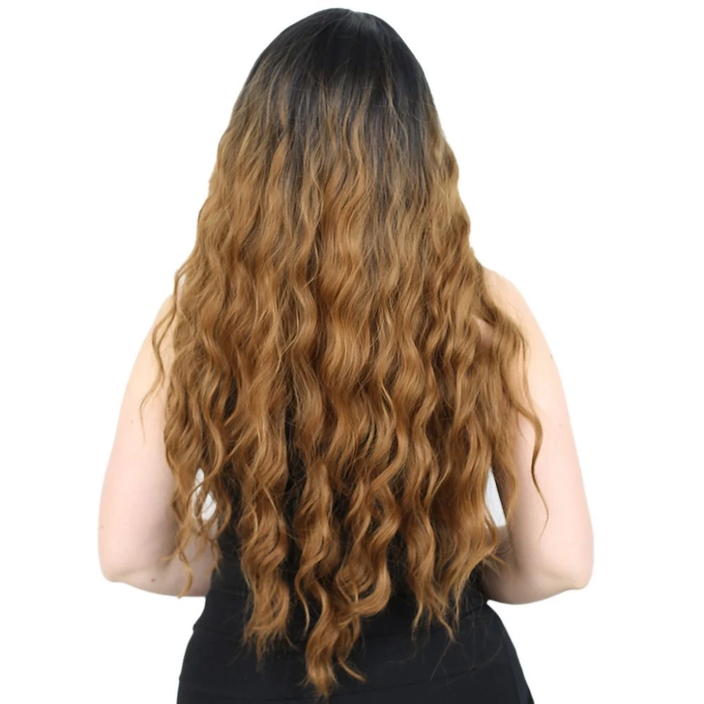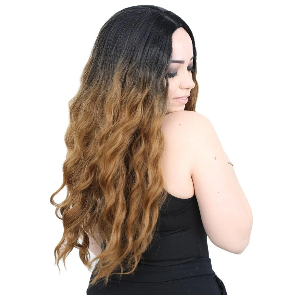 Su Dalgası Uzun Perçemsiz Fiber Sentetik Peruk - Siyah / Karamel Ombreli