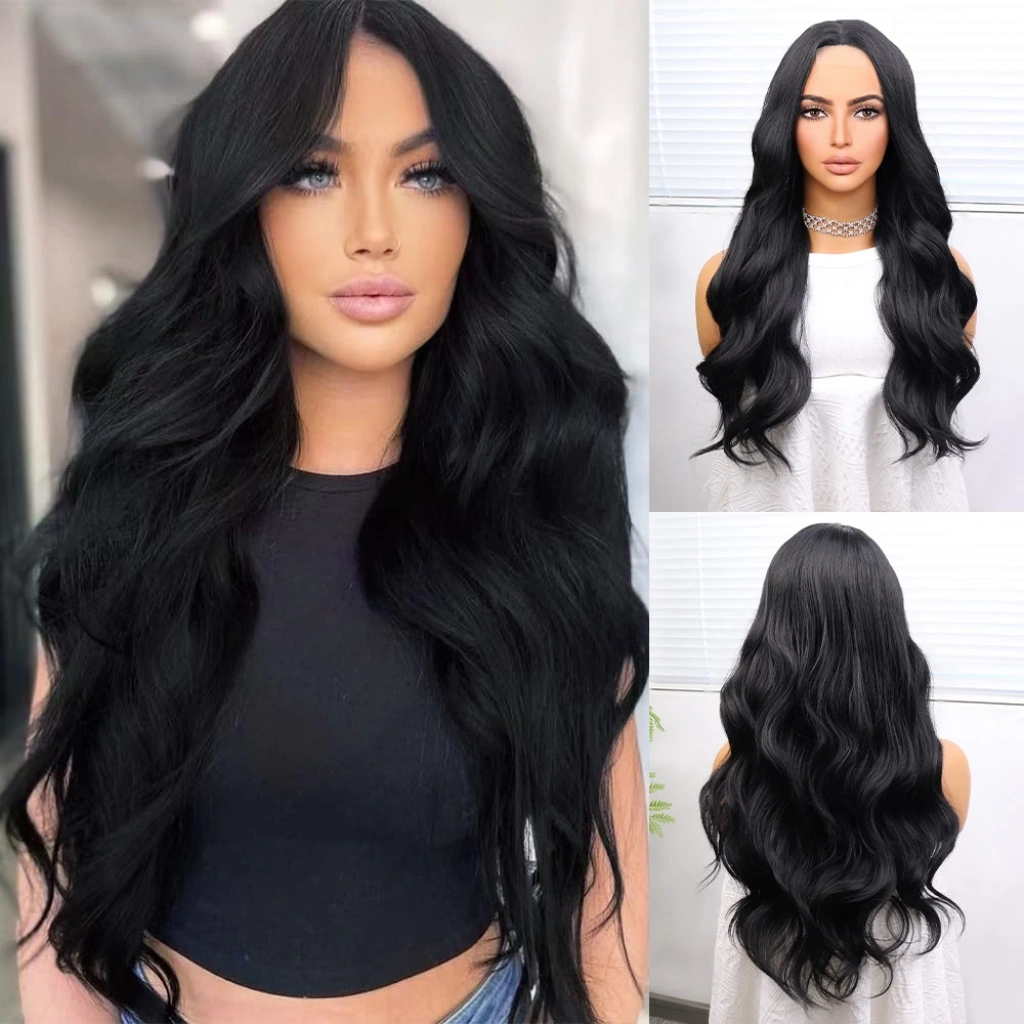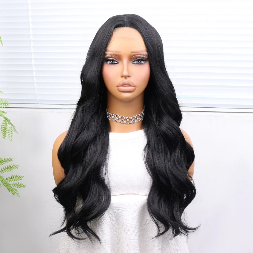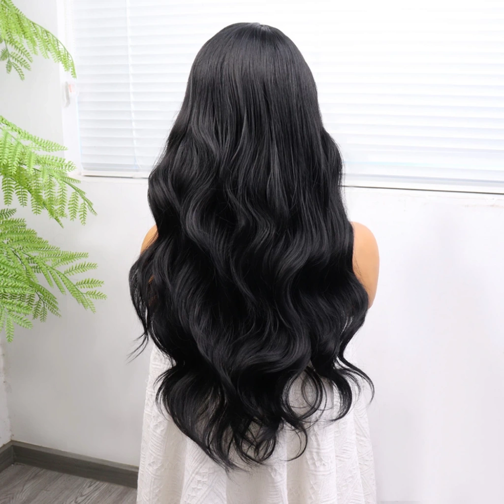 Uzun Siyah Su Dalgalı Fiber Sentetik Tül Peruk