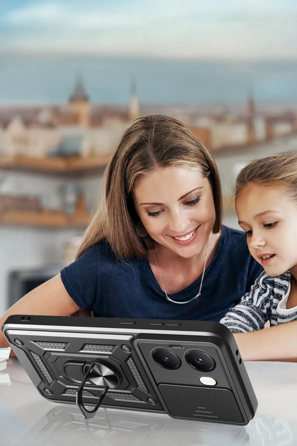 Kılıfın arka kısmında yer alan entegre metal halka hem tutucu hem de stand olarak işlev görür. Eller serbest video izleme, içerik görüntüleme ya da masaüstü kullanımı için idealdir.