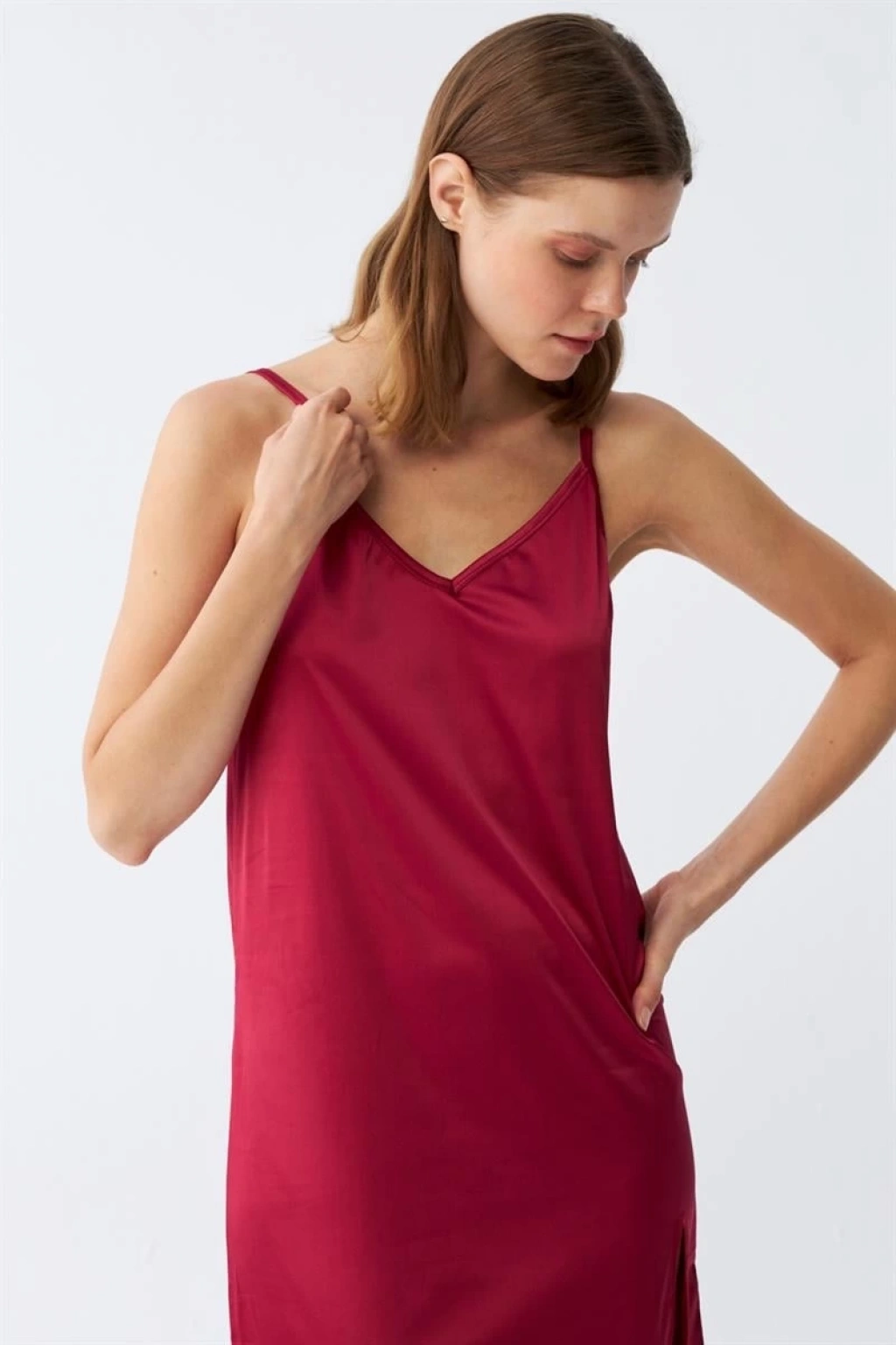 Gecenize ihtişam katmak ve kendinizi özel hissetmek için Yırtmaçlı Uzun Saten Gecelik Bordo tam size göre!